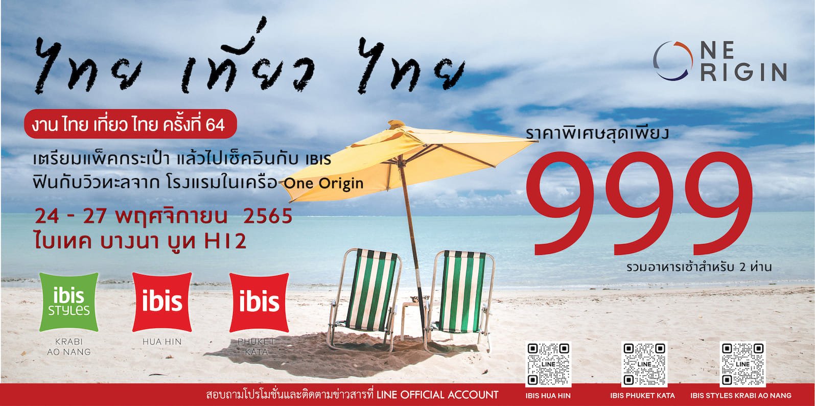 สายเที่ยว สายชิลล์ เตรียมล็อคคิวแพ็คกระเป๋าออกเดินทางท่องเที่ยวทริปทะเลแบบฟินๆ ONE ORIGIN จัดโปรโมชั่นพิเศษ แนะนำโรงแรมทั้ง 3 แห่งวิวทะเล ได้แก่ โรงแรมไอบิส หัวหิน, ไอบิส ภูเก็ต กะตะ และไอบิส สไตล์ กระบี่ อ่าวนาง เปิดจองห้องพักในราคาพิเศษฉลองหยุดยาวช่วงสิ้นปี ในราคาเริ่มต้นเพียง 999 บาท เสิร์ฟพร้อมอาหารเช้าสุดคุ้ม เพลิดเพลินกับสิ่งอำนวยความสะดวกภายในห้องพัก พักผ่อนเต็มที่ ชาร์จพลังเต็มแม็กซ์กับกลุ่มเพื่อน ครอบครัว และคนพิเศษ