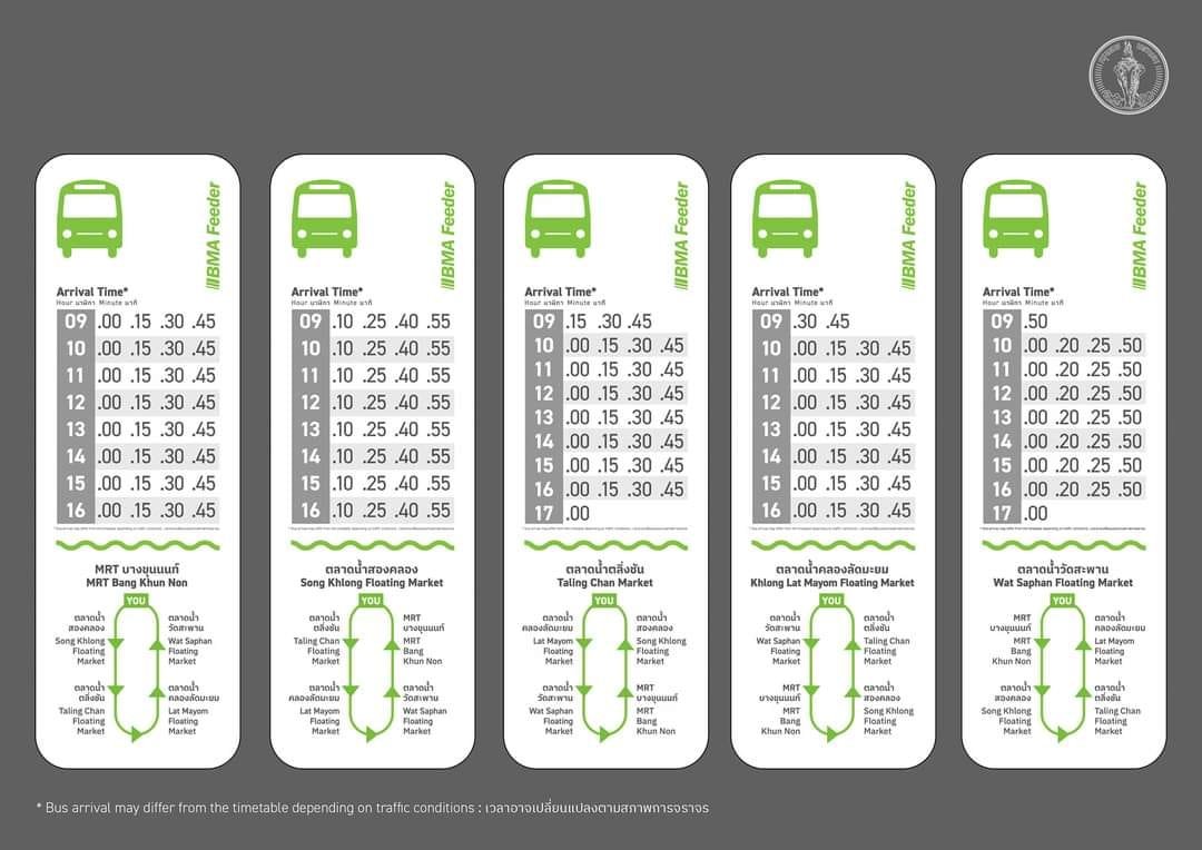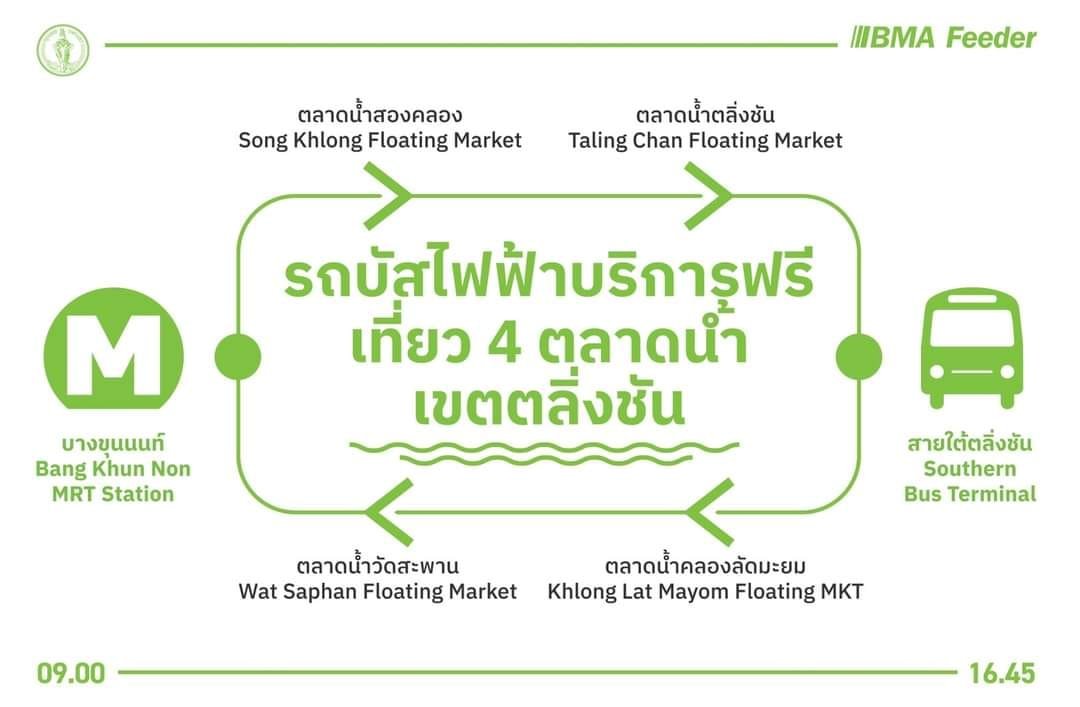 สำหรับ “รถบัสไฟฟ้าฟรี เที่ยว 4 ตลาดน้ำ” มีจุดจอดรับ-ส่ง ทั้งหมด 6 จุด ได้แก่ สถานีรถไฟฟ้าบางขุนนนท์ ระหว่างทางออก 2 และ 3 ตลาดน้ำสองคลองวัดตลิ่งชัน ตลาดน้ำตลิ่งชัน สถานีขนส่งผู้โดยสารสายใต้ตลิ่งชัน ตลาดน้ำคลองลัดมะยม และตลาดน้ำวัดสะพาน