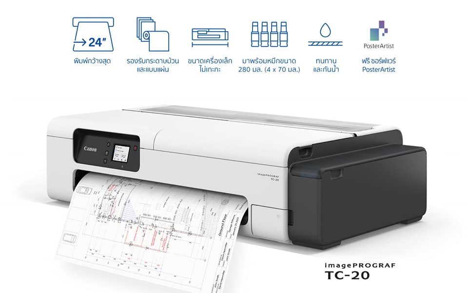 แคนนอน (CANON) แบรนด์ผู้นำด้านเทคโนโลยีอิมเมจจิ้งระดับโลก เปิดตัว "imagePROGRAF TC-20" เดสท็อปพรินเตอร์ 4 สี (pigment) แบบหน้ากว้างรุ่นแรกที่รองรับกระดาษขนาดใหญ่ระดับ A1 เพื่อตอบสนองการพิมพ์งานบนสื่อขนาดใหญ่ในพื้นที่ทำงานขนาดเล็ก โดยเครื่องพิมพ์ TC-20 ยังรองรับการทำงานแบบไฮบริดและการทำงานทางไกลในธุรกิจหลายประเภท โดยเฉพาะงานของสถาปนิก วิศวกร และช่างรับเหมาก่อสร้าง รวมถึงแวดวงการศึกษาและธุรกิจค้าปลีกต่าง ๆ โดยใช้ได้กับกระดาษม้วนหน้ากว้างสูงสุดถึงไซส์ A1 พร้อมตัวป้อนกระดาษ (Auto Sheet Feeder: ASF) แบบบิลต์อิน สามารถพิมพ์สื่อขนาด A3/A4 ได้อย่างต่อเนื่องเพื่อช่วยเพิ่มกำลังการผลิตได้สูงสุด นอกจากนี้ยังใช้งานได้กับซอฟต์แวร์และแอปพลิเคชันฟรีอื่น ๆ เช่น PosterArtist ซึ่งทำให้เครื่องพิมพ์ TC-20 ใช้งานง่าย มอบความสะดวกสบายในการใช้งานได้อย่างดีเยี่ยมเช่นเดียวกับเครื่องพิมพ์หน้ากว้างระดับไฮเอนด์อื่นๆ ในซีรีส์ imagePROGRAF