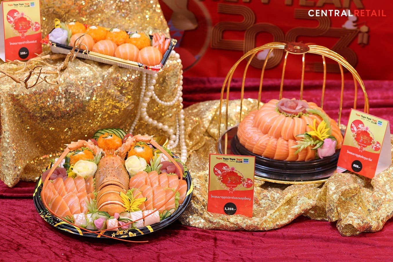 พรีเมียมพร้อมจัดเซตจำหน่ายในราคาสุดคุ้ม, เซทมงคลอาหารไหว้ซีฟู้ดพรีเมี่ยม เซทมงคลอาหารไหว้ซีฟู้ดหม้อไฟ เค้กส้มแซลมอนมงคล จากธรรมชาติซีฟู้ดที่คัดสรรสุดยอดซีฟู้ดทั้งกุ้งมังกร หอยเป๋าฮื้อ แซลมอน สื่อถึงความหมายมงคลและความรุ่งเรือง, พิเศษกับชุดไหว้สุดเอ็กซ์คลูซีฟซึ่งร่วมกับบุญตงกี่ร้านอาหารชื่อดัง ได้แก่ บุญตงกี่ชุดไหว้มหามงคล ชุดไหว้ร่ำรวยทรัพย์ และชุดไหว้มั่งมี จำหน่ายผ่าน Tops Online และ Personal Shopper นอกจากนั้นยังมีขนมมงคลนานาชนิด เช่น ขนมปุยฝ้ายปลาคราฟ, พุ่มซิ่วท้อโดม, พายเปี๊ยะจากฮั่วเซ่งฮง, ชุดปลาดิบรวม ซูชิเค้กภูเขาไฟจากไคเซนมารุ, ชุดผลไม้มงคลพรีเมี่ยม, ส้มนานาชนิด, แอปเปิลฟูจิพิมพ์อักษรมงคล, กระดาษไหว้บรรพบุรุษในรูปแบบพิเศษ ชุดไหว้เทพเจ้าไฉ่ซิงเอี๊ยะ ฯลฯ