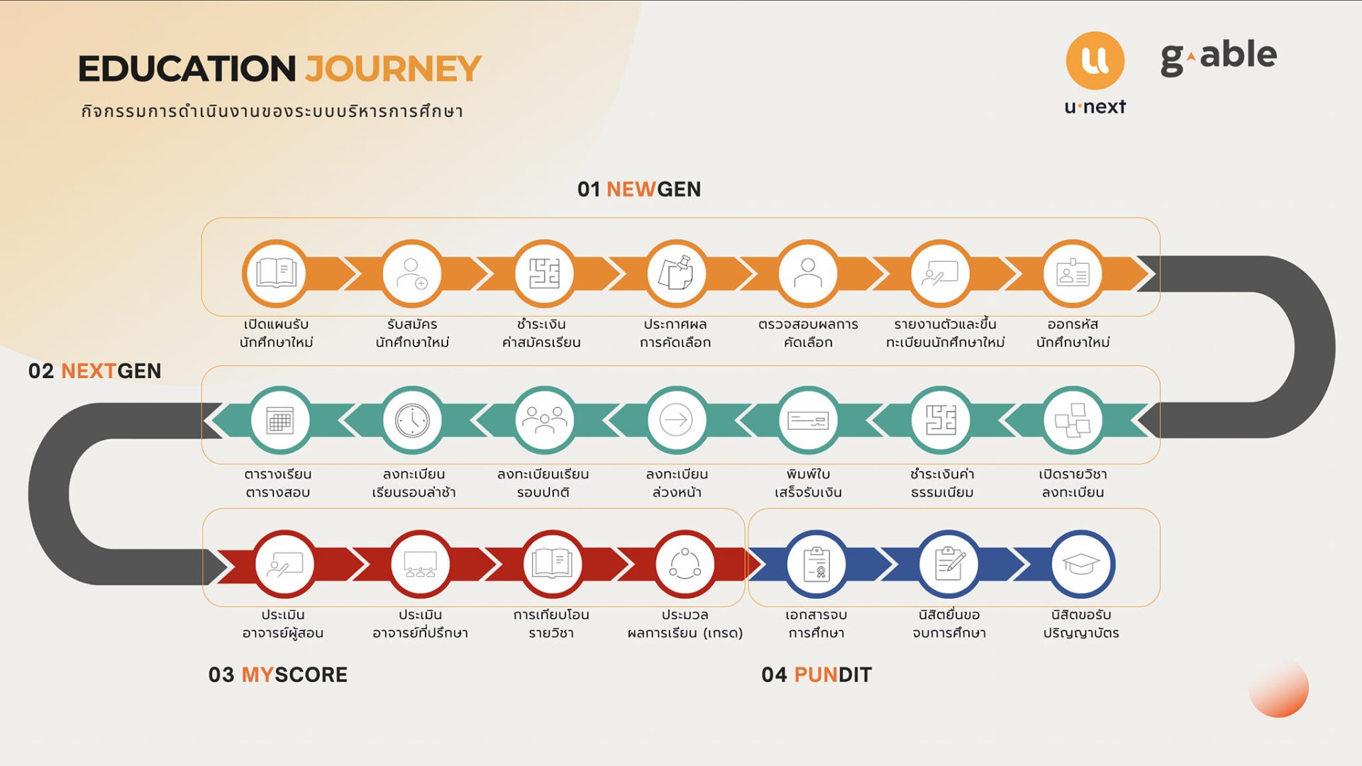 สำหรับ Education Journey หรือแผนการบริหารการศึกษาของแพลตฟอร์ม U-NEXT จะมีทั้งหมด 4 ระบบดังนี้