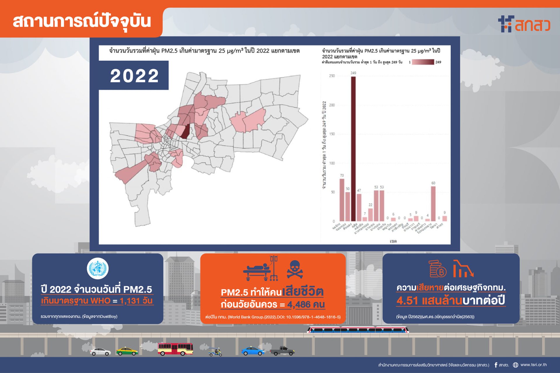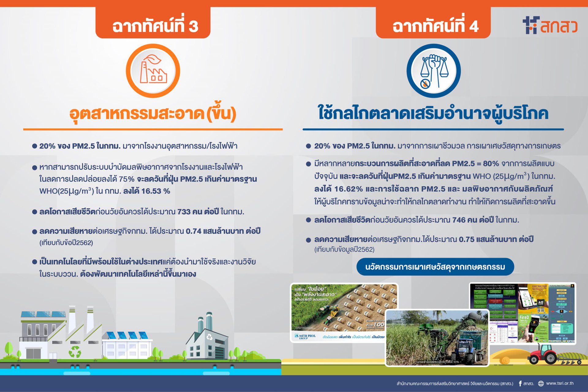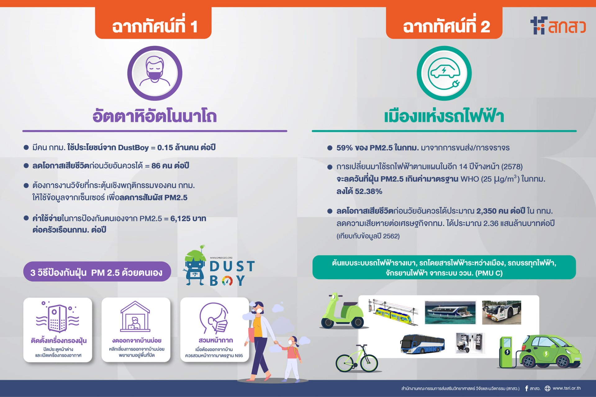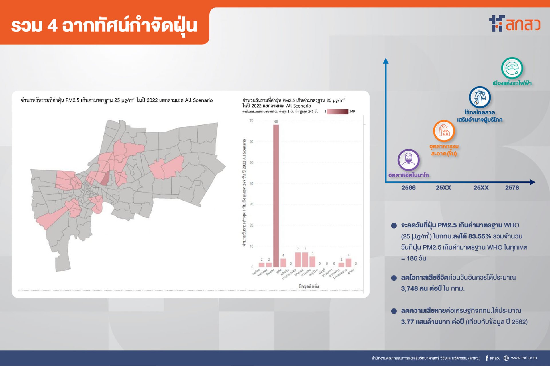 รศ. ดร.ธนพล เพ็ญรัตน์ ผู้เชี่ยวชาญระดับสูง สกสว. ได้กล่าวถึงการวิเคราะห์ 4 ฉากทัศน์ของการจัดการฝุ่นและมลพิษทางอากาศ โดยการใช้ AI ประมวลผลจากงานวิจัยกว่า 20,000 ชิ้นงาน พบว่าหากได้ร่วมกันนำผลงานวิจัยมาใช้ประโยชน์อย่างเต็มศักยภาพ จะสามารถลดวันที่ฝุ่น PM 2.5 เกินค่ามาตรฐานในกรุงเทพมหานคร ได้ถึงร้อยละ 83.55 และลดโอกาสการเสียชีวิตก่อนวัยอันควรได้โดยเฉลี่ยประมาณ 3,748 คนต่อปี