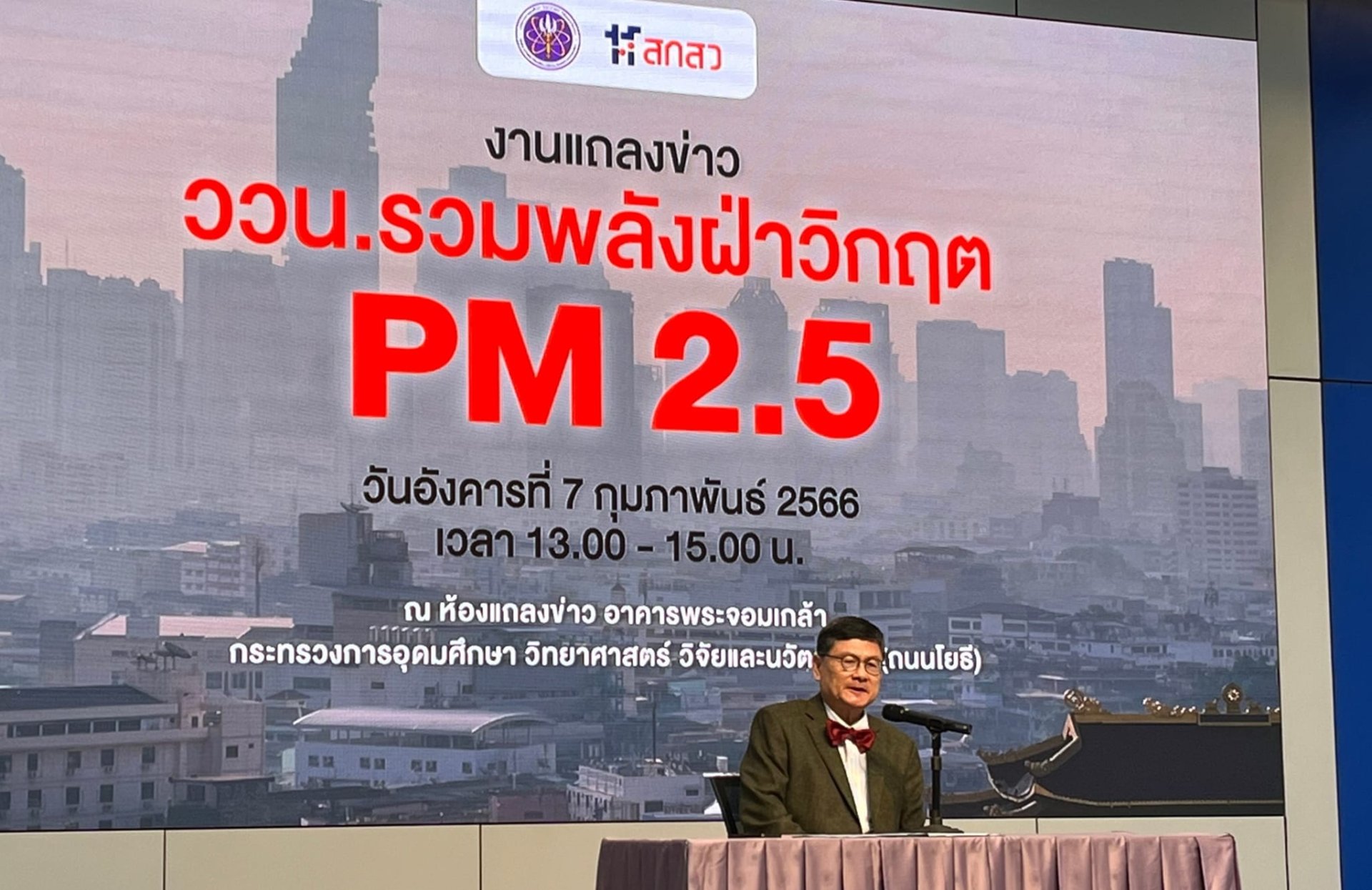 ศ.พิเศษ ดร.เอนก เหล่าธรรมทัศน์ รัฐมนตรีว่าการกระทรวงการอุดมศึกษา วิทยาศาสตร์ วิจัยและนวัตกรรม (อว.) เป็นประธานแถลงข่าว “ววน.รวมพลังฝ่าวิกฤต PM2.5” ณ ห้องประชุม อาคารพระจอมเกล้า ถนนโยธี ซึ่ง อว. มีความร่วมมือกับเครือข่ายภาคีต่าง ๆ ในการนำวิทยาศาสตร์ วิจัยและนวัตกรรม (ววน.) เป็นเครื่องมือในการแก้วิกฤตทางอากาศ ซึ่งประเทศไทยกำลังประสบปัญหาค่าความเข้มข้นของ PM2.5 ในบรรยากาศเกินค่ามาตรฐานความปลอดภัยต่อสุขภาพประชาชน ทั้งในกรุงเทพมหานครและหลายจังหวัดทั่วประเทศในช่วงหลายเดือนที่ผ่านมา และเป็นปัญหาที่จะเกิดขึ้นอย่างต่อเนื่องในอนาคต