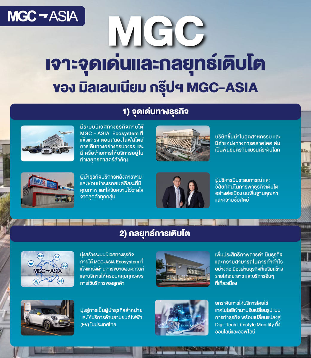 บมจ.มิลเลนเนียม กรุ๊ป คอร์ปอเรชั่น (เอเชีย) หรือ "มิลเลนเนียม กรุ๊ปฯ MGC-ASIA" แสดงวิสัยทัศน์ผู้นำธุรกิจค้าปลีกยานยนต์ Lifestyle Mobility Ecosystem วางกลยุทธ์ขับเคลื่อนธุรกิจ พัฒนาระบบนิเวศทางธุรกิจภายใต้กลุ่ม MGC-ASIA สู่ธุรกิจที่มีศักยภาพเติบโตสูงในอนาคต เพื่อให้ครอบคลุมทุกวงจรการใช้บริการของลูกค้า และสร้างการเติบโตอย่างยั่งยืน เตรียมพร้อมเดินหน้าเสนอขาย IPO เข้าจดทะเบียนในตลาดหลักทรัพย์แห่งประเทศไทย