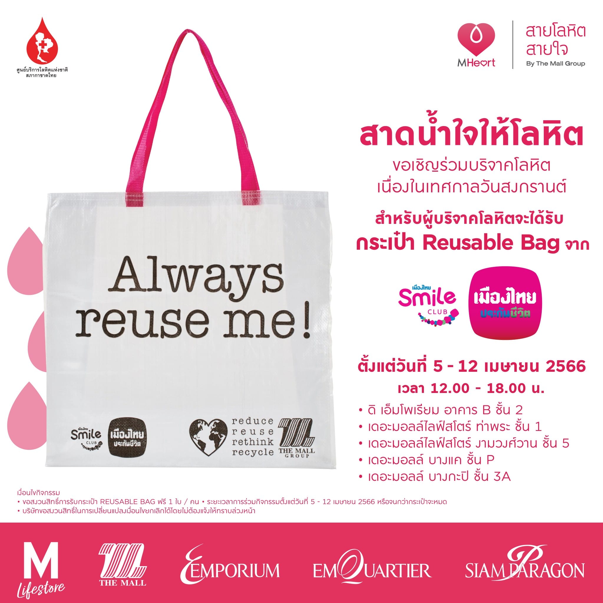 สงกรานต์ปีนี้ เดอะมอลล์ กรุ๊ป เล็งเห็นถึงความสำคัญในการจัดหาโลหิตเพื่อนำไปช่วยชีวิตเพื่อนมนุษย์ที่ต้องการความช่วยเหลืออย่างเร่งด่วน เชิญชวนประชาชนร่วมบริจาคโลหิต ในโครงการ “สาดน้ำใจให้โลหิต” เพื่อช่วยเหลือผู้ป่วยในช่วง 7 วันอันตราย พร้อมได้รับการสนับสนุนกระเป๋า Reusable Bag จาก บริษัท เมืองไทยประกันชีวิต จำกัด (มหาชน) เพื่อมอบให้กับผู้ร่วมบริจาคโลหิตฟรี ตั้งแต่วันที่ 5–12 เมษายน 2566 (เฉพาะสาขาใน กทม.เท่านั้น) ร่วมสร้างกุศลด้วยการบริจาคโลหิตได้อย่างต่อเนื่องตลอด 365 วัน ที่ห้องบริจาคโลหิตถาวร (Fixed Station) ทั้ง 6 สาขา ได้แก่ เดอะมอลล์ไลฟ์สโตร์ งามวงศ์วาน และท่าพระ,เดอะมอลล์ บางแค, เดอะมอลล์ บางกะปิ, เดอะมอลล์ นครราชสีมา และดิ เอ็มโพเรียม พร้อมเปิดให้บริการทุกวัน ตั้งแต่เวลา 12.00 – 18.00 น.