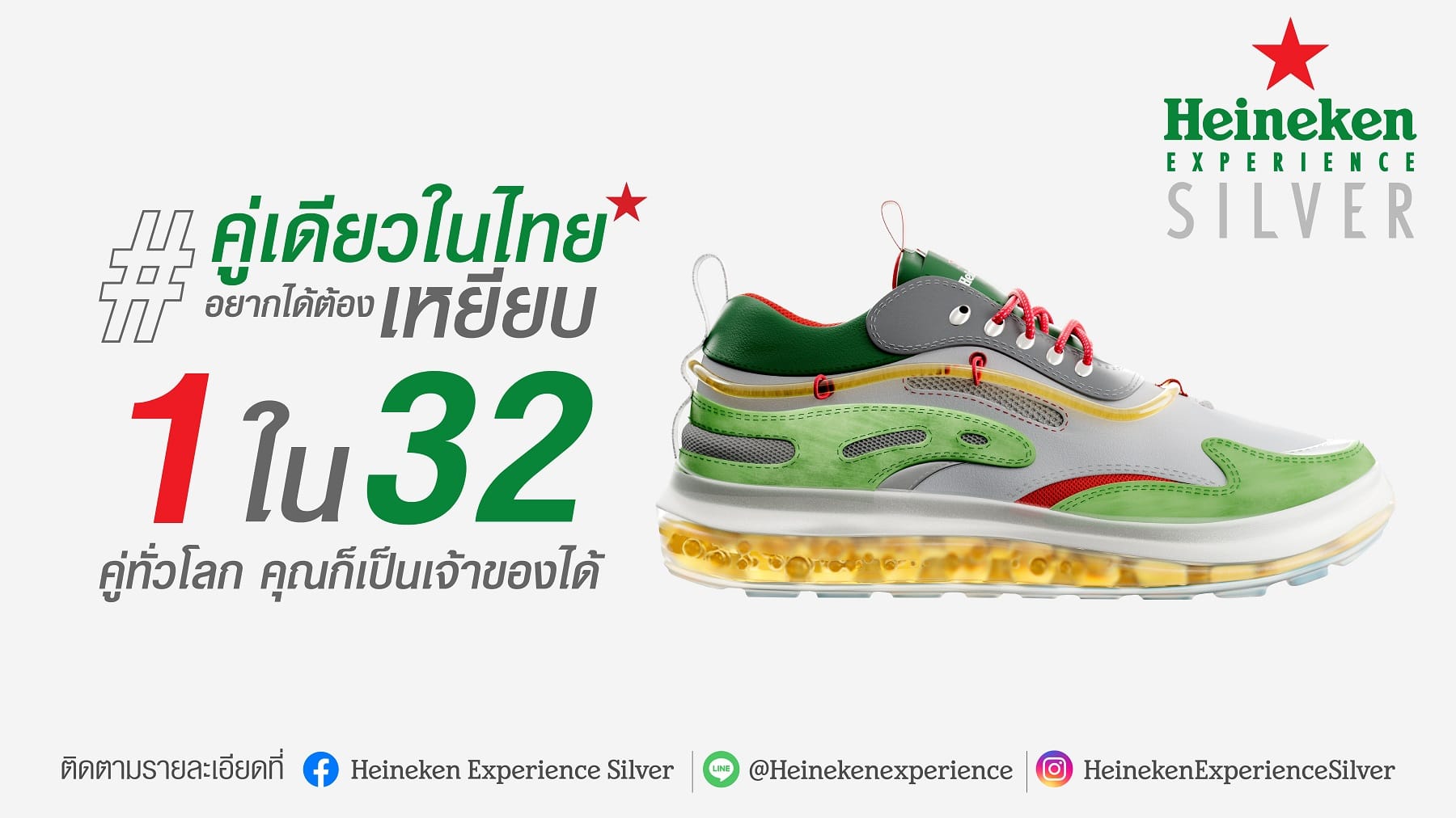 ตลอดทั้งปีนี้ทุกคนจะได้พบกับไลฟ์สไตล์ไอเท็มมากมายจากแบรนด์ Heineken Experience Silver โดยเริ่มต้นด้วยการโชว์เคสรองเท้าที่เป็นผลงานระดับโลกของ “Dominic Ciambrone” (โดมินิก แซมโบรเน่) ศัลยแพทย์ผู้ก่อตั้งสตูดิโอออกแบบรองเท้า “The Shoe Surgeon” ซึ่งรองเท้าคู่นี้มีเพียงคู่เดียวในประเทศไทยจาก 32 คู่ทั่วโลก และเปิดโอกาสให้ทุกคนร่วมกิจกรรมลุ้นเป็นเจ้าของผ่านแคมเปญจากแบรนด์ Heineken Experience Silver #คู่เดียวในไทยอยากได้ต้องเหยียบ #HeinekenExperienceSilver เชิญชวนให้ทุกคนมาครีเอทโมเมนต์การเหยียบวัดไซส์รองเท้ากับภาพโฆษณา “The Ads you can kick” บนสื่อ Out-Of-Home ทั่วกรุงเทพฯ รวมไปถึง Giant Shoebox ที่ตั้งอยู่ที่สามย่านมิตรทาวน์ เพื่อลุ้นเป็นเจ้าของไลฟ์สไตล์ไอเท็มชิ้นนี้แต่เพียงผู้เดียวในประเทศไทย จุดกระแสกลุ่มเป้าหมายคนรุ่นใหม่ โดยเฉพาะกลุ่มแฟชั่นนิสต้าและเหล่า Sneakerhead ให้มาร่วมแคมเปญ