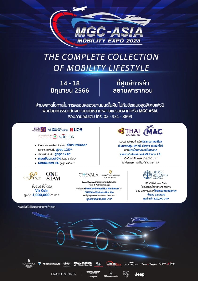 "เอ็มจีซี-เอเชีย" จับมือ สยามพารากอน จัดงานใหญ่ ‘MGC-ASIA Mobility Expo 2023’ สัมผัสยานยนต์และโมบิลิตี้ระดับโลก ครั้งแรก! ครบทุกรสนิยมการเดินทาง ระหว่าง 14-18 มิถุนายน 2566 นี้ ที่ศูนย์การค้าสยามพารากอน