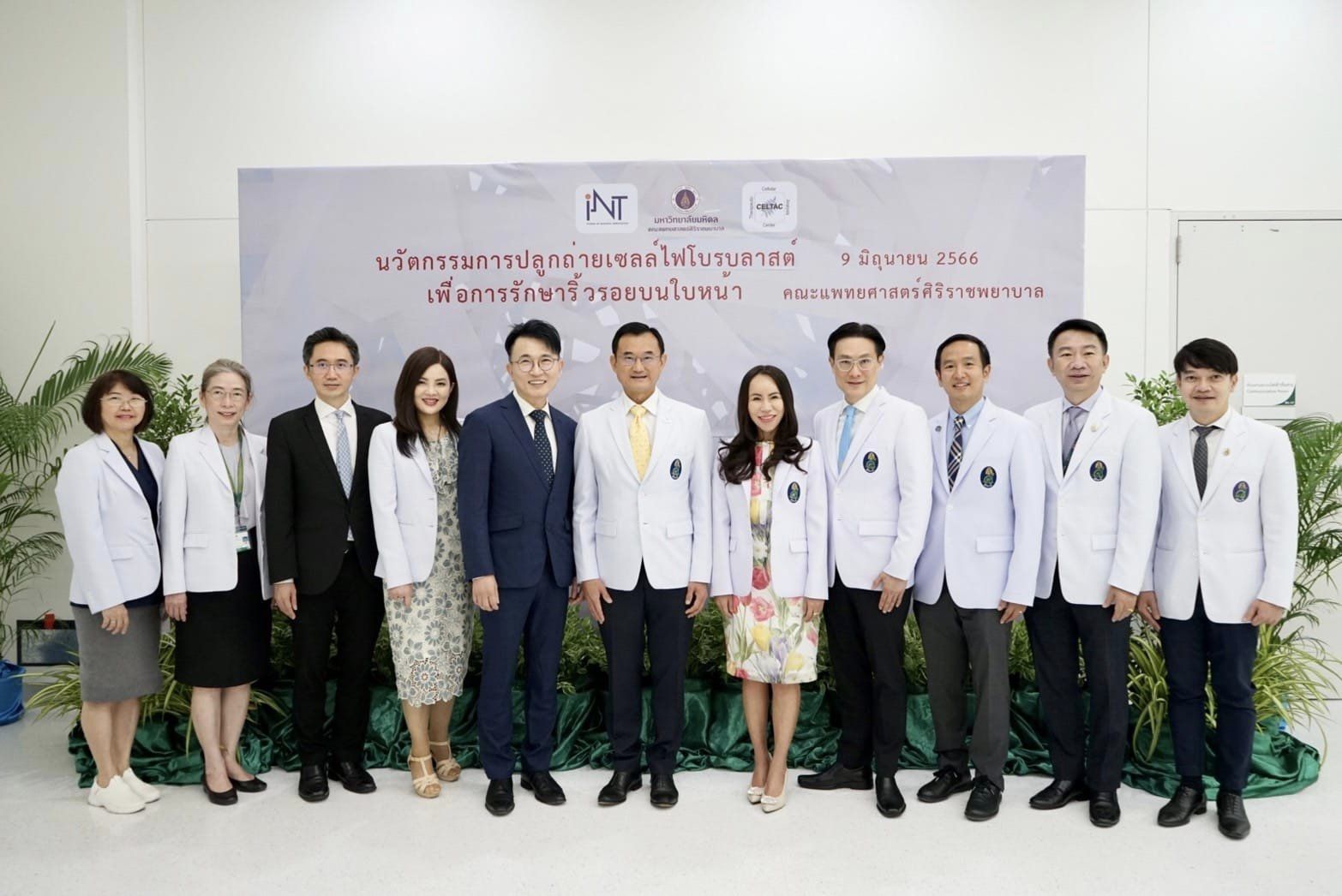 ศ. นพ.อภิชาติ อัศวมงคลกุล คณบดีคณะแพทยศาสตร์ศิริราชพยาบาล ม.มหิดล ให้เกียรติเป็นประธานเปิดงานแถลงข่าว “ครั้งแรกของเอเชีย ศิริราชคิดค้นนวัตกรรมการปลูกถ่ายเซลล์ไฟโบรบลาสต์ เพื่อการรักษาริ้วรอยบนใบหน้า” ณ ห้องประชุมสิรินธร อาคารเฉลิมพระเกียรติ ชั้น G รพ.ศิริราช โดยมี ศ. ดร. พญ.อุไรวรรณ พานิช หัวหน้าภาควิชาเภสัชวิทยา ศ. พญ.รังสิมา วณิชภักดีเดชา อาจารย์ประจำภาควิชาตจวิทยา ผศ. ดร. นพ.พัฒนา เต็งอำนวย คณบดี วิทยาลัยการแพทย์บูรณาการ มหาวิทยาลัยธุรกิจบัณฑิตย์ และกรรมการบริหาร บริษัท เซลแทค จำกัด พร้อมด้วย ศ.คลินิก นพ.วิศิษฎ์ วามวาณิชย์ ผู้อำนวยการ รพ.ศิริราช รศ. ดร.ยศชนัน วงศ์สวัสดิ์ ผู้อำนวยการสถาบันบริหารจัดการเทคโนโลยีและนวัตกรรม ม.มหิดล ร่วมเป็นสักขีพยาน