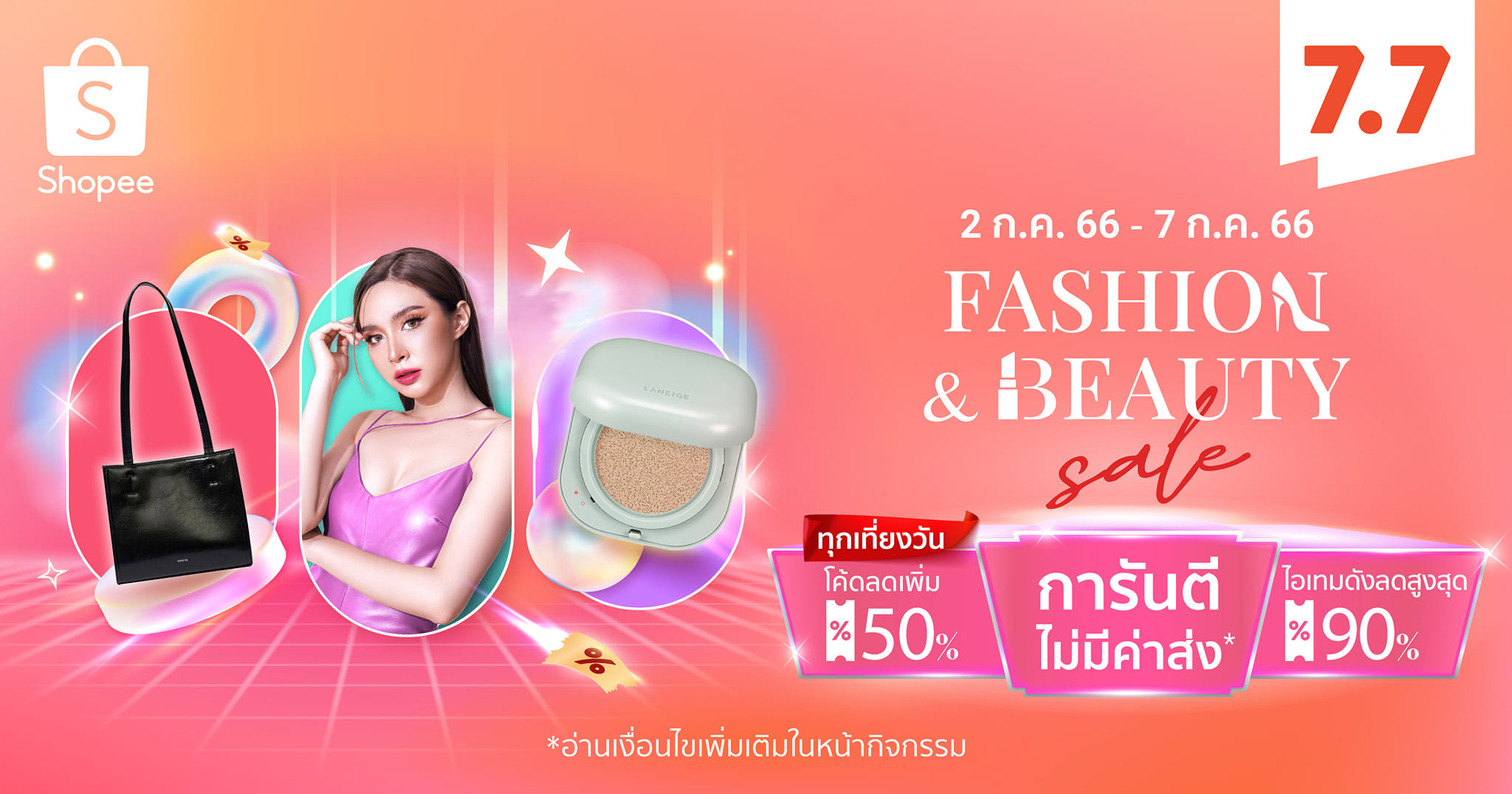 ช้อปปี้ยกขบวนแฟชั่นและบิวตี้ไอเทมสุดปัง พร้อมโปรโมชันลดกระหน่ำ รับหน้าฝนในแคมเปญ ‘Shopee Fashion & Beauty Sale’ ตั้งแต่วันที่ 2 กรกฎาคม - 8 กรกฎาคม 2566 ไฮไลท์ด้วยโค้ดเปรี้ยงลด 50% ทุกเที่ยงวัน โค้ดแฟชั่นลดเพิ่มสูงสุด 15%[2] สินค้าลดสูงสุด 90% และโค้ดส่งฟรี ขั้นต่ำ 0 บาท[3] ไม่เพียงเท่านี้ นักช้อปยังช้อปฟินไปกับส่วนลดจากธนาคารชั้นนำสูงสุด 25%[4] หรือแลกพอยท์ รับโค้ดแทนเงินสดสูงสุด 1,000 บาท[5] จากสมาชิกพาร์ทเนอร์ชั้นนำ เฉพาะวันที่ 7 กรกฎาคม 2566 เท่านั้น!