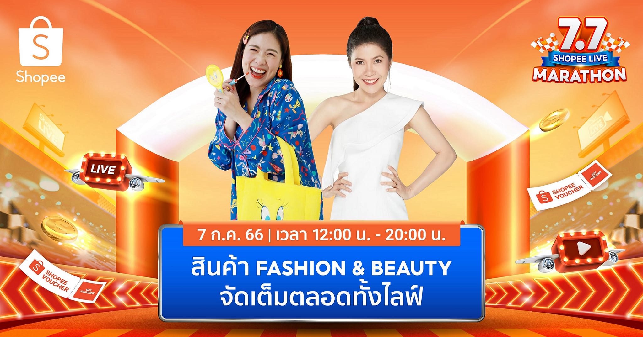 ช้อปสนุกต้องไม่พลาดกับ Shopee Live ฟีเจอร์ยอดฮิตที่สาวๆ กว่า 75% ในภูมิภาคเอเชียตะวันออกเฉียงใต้และไต้หวัน ใช้อัปเดตลุคแฟชั่นอินเทรนด์และส่องโปรโมชันเด็ดราคาโดน เตรียมพบกับความสนุกแบบมาราธอน และโปรลับสุดเซอร์ไพร์ใน 7.7 Shopee Live Countdown ที่จะมาป้ายยาสินค้าเด็ดและโค้ดส่วนลดสุดเซอร์ไพรส์ถึง 900 บาท ช้อปปิ้งเคาท์ดาวน์ก่อนใครได้ในวันที่ 6 กรกฎาคม 2566 เวลา 23:00 น. - วันที่ 7 กรกฎาคม 2566 เวลา 01:00 น. นอกจากนี้ยังยกระดับความสนุกพาเหล่าซุปตาร์ อาตุ๊ยตุ่ย และ ไอซ์พาดี้ พ่วงมาด้วยรายการเกมโชว์สุดฮิตอย่าง "แบรนด์ฮิต พิชิตโค้ด" ที่จะมาแจกทั้งโค้ดส่วนลดสูงสุด 1,500 บาท และช้อปปี้คอยน์ตลอดทั้งไลฟ์ ใน วันที่ 7 กรกฎาคม 2566 ตั้งแต่เวลา 12:00 น.- 20:00 น.ที่ Shopee Live บนช้อปปี้ ติดตามรายละเอียดเพิ่มเติมได้ที่ https://shopee.co.th/m/shopee-live-original