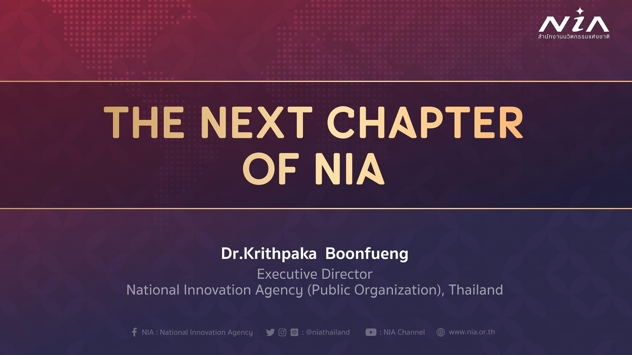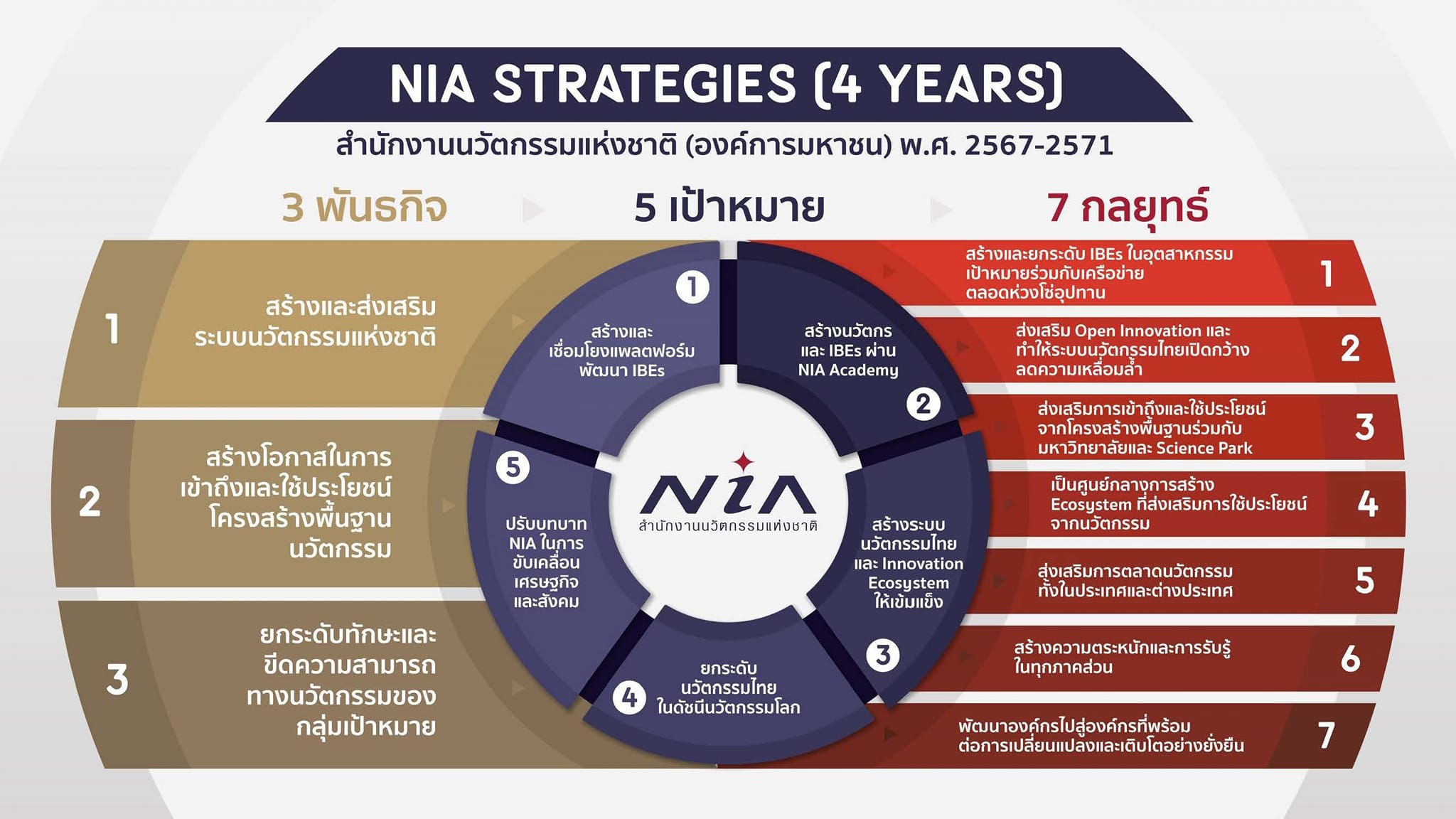 สำนักงานนวัตกรรมแห่งชาติ (องค์การมหาชน) หรือ NIA เดินหน้าขับเคลื่อนดัชนีนวัตกรรมประเทศไทยสู่อันดับที่ 30 ในปี พ.ศ.2573 ภายใต้บทบาท “ผู้กำหนดทิศทางนวัตกรรม (Focal Conductor)” ที่เชื่อมการทำงานร่วมกับพันธมิตรทั้งในประเทศและต่างประเทศ เพื่อส่งเสริมสนับสนุนผู้ประกอบการฐานนวัตกรรมในทุกมิติ อันจะนำไปสู่การสร้างผลกระทบทั้งด้านเศรษฐกิจและสังคมของประเทศอย่างยั่งยืน