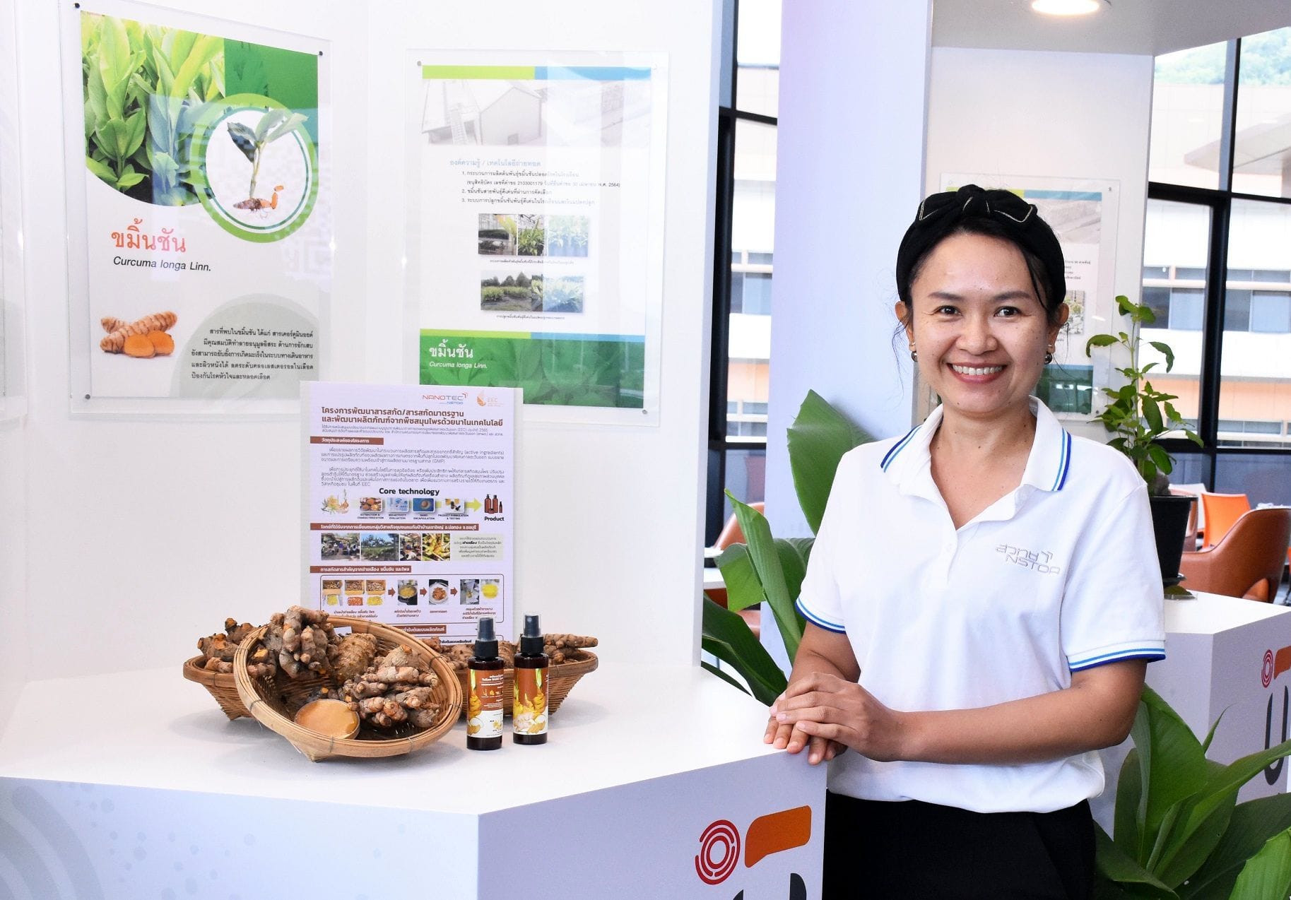 พืชชนิดที่สอง ขมิ้นชัน โดย ดร.รุจิรา ทิศารัมย์ นักวิจัยจากทีมวิจัยนวัตกรรมด้านพันธุศาสตร์และสรีรวิทยาพืช มีการศึกษากระบวนการผลิตต้นพันธุ์ การคัดเลือกสายพันธุ์ และระบบการปลูกในโรงเรือนและแปลงปลูก