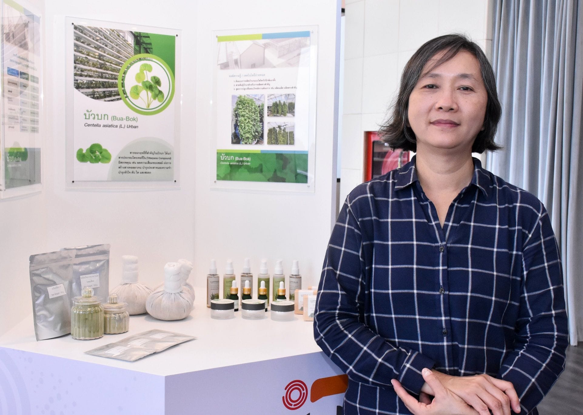 พืชชนิดแรกคือ บัวบก โดย ดร.กนกวรรณ รมยานนท์ นักวิจัยจากทีมวิจัยนวัตกรรมโรงงานผลิตพืชสมุนไพร มีการศึกษาต้นแบบการผลิตบัวบกในระบบปลูกแนวตั้ง ที่เพิ่มผลผลิตต่อพื้นที่สูงขึ้น บัวบกสายพันธุ์ดี ได้แก่ ไบโอบก-143 และ ไบโอบก-296 ทั้งสองสายพันธุ์ ที่คัดเลือกมาจากการรวบรวมสายพันธุ์บัวบกกว่า 200 สายพันธุ์ ซึ่งให้ผลผลิตและปริมาณสารสำคัญสูง