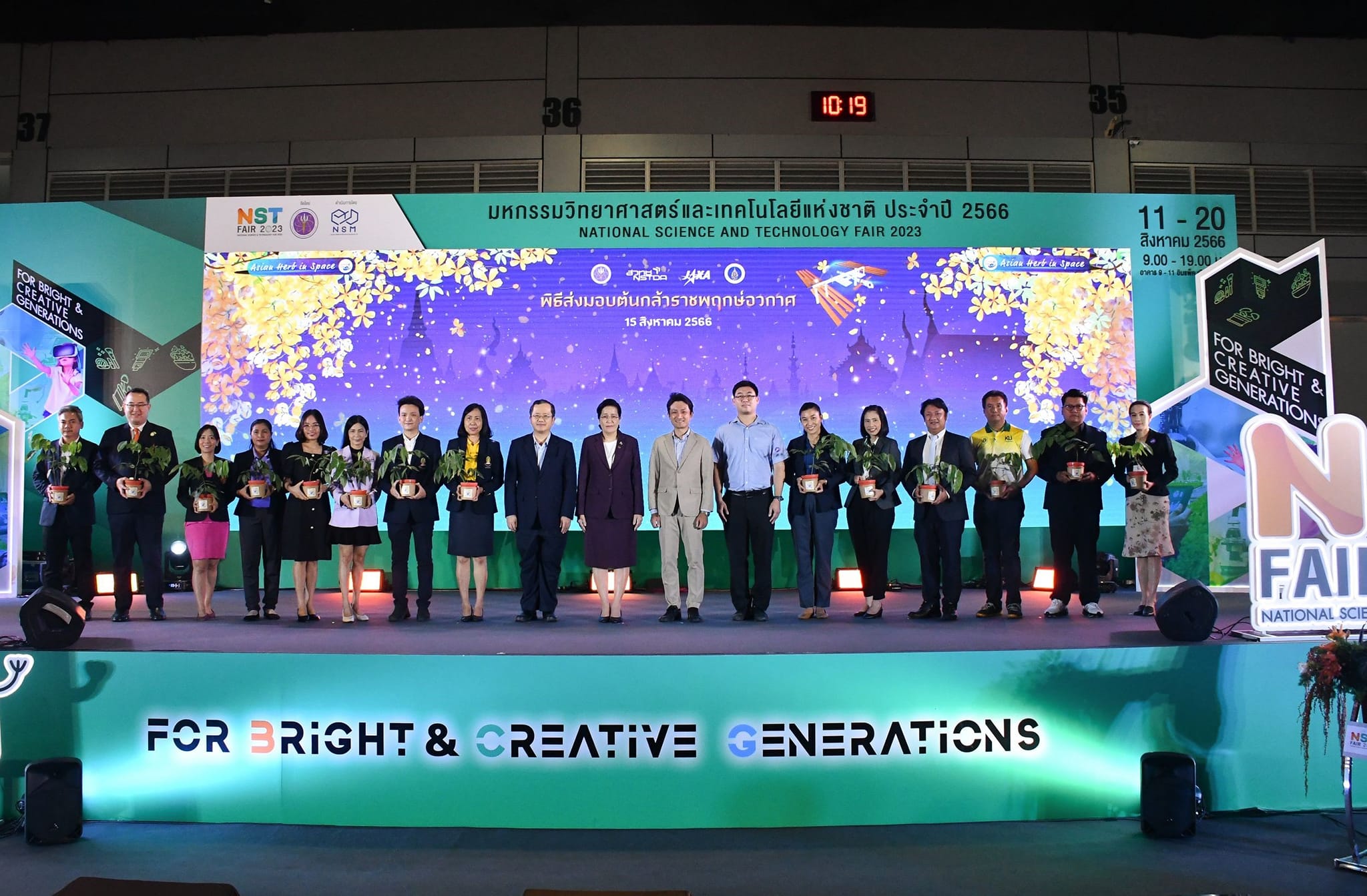 กระทรวงการอุดมศึกษา วิทยาศาสตร์ วิจัยและนวัตกรรม (อว.) สำนักงานพัฒนาวิทยาศาสตร์และเทคโนโลยีแห่งชาติ (สวทช.) โดย ดร.จุฬารัตน์ ตันประเสริฐ รองผู้อำนวยการ สวทช.ร่วมกับ องค์การสำรวจอวกาศญี่ปุ่น หรือ แจ็กซา (Japan Aerospace Exploration Agency: JAXA) โดยมีนายทาเคฮิโระ นากามูระ ผู้อำนวยการองค์การสำรวจอวกาศญี่ปุ่น สำนักงานกรุงเทพฯ และมหาวิทยาลัยมหิดล ร่วมส่งมอบต้นกล้าราชพฤกษ์ที่ปลูกโดยใช้เมล็ดที่ผ่านการท่องอวกาศนาน 7 เดือน ให้แก่สถาบันการศึกษาและหน่วยงานภาครัฐรวม 22 แห่งทั่วประเทศนำไปปลูก เพื่อต่อยอดสู่การเรียนรู้วิทยาศาสตร์จากการศึกษาเปรียบเทียบการเติบโตระหว่างต้นราชพฤกษ์อวกาศที่ปลูกด้วยเมล็ดจากอวกาศกับต้นราชพฤกษ์ที่ปลูกด้วยเมล็ดปกติ ภายในงานมหกรรมวิทยาศาสตร์และเทคโนโลยีแห่งชาติ ประจำปี 2566