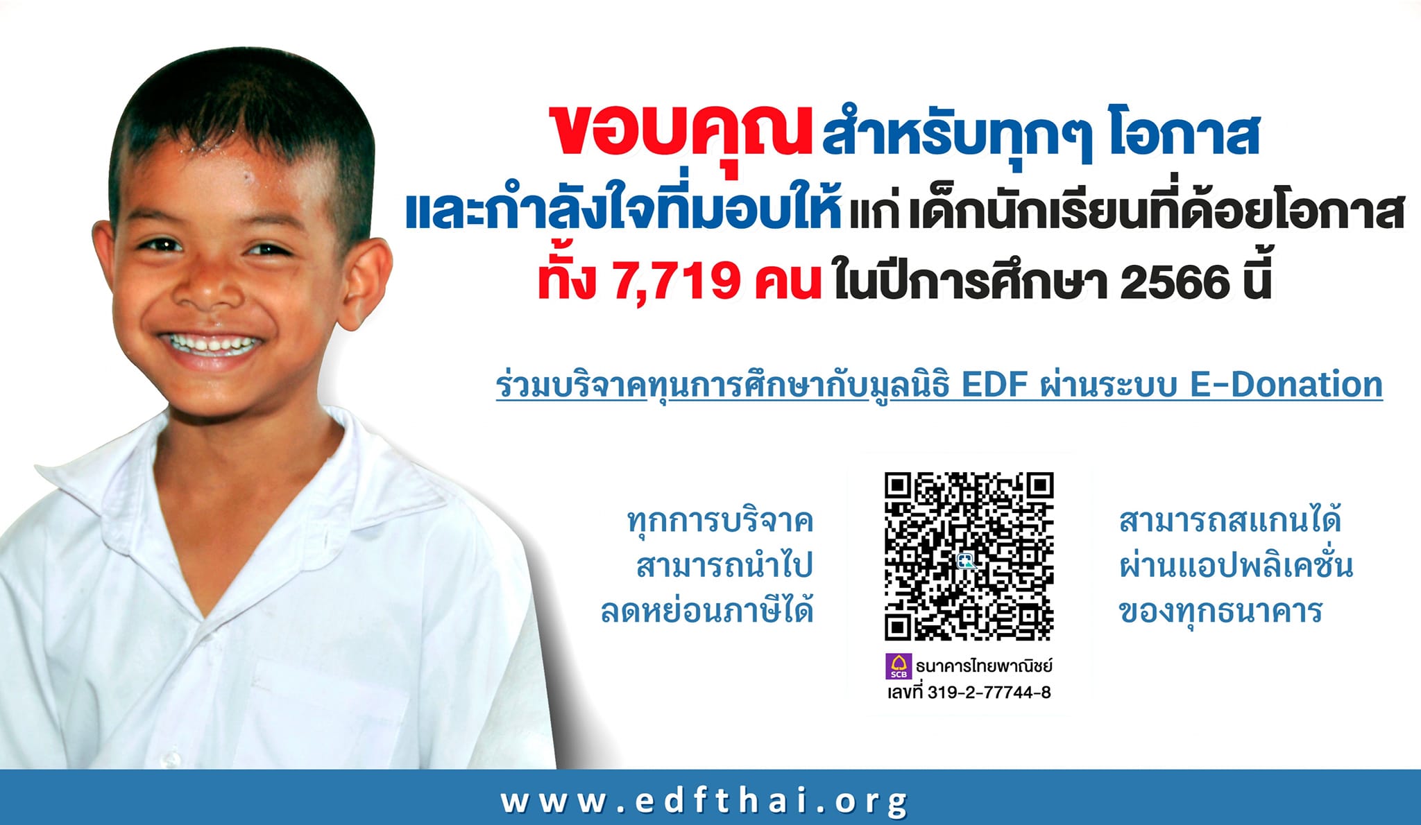 นายสรรเพชร นิลรัตน์ กรรมการผู้จัดการมูลนิธิ EDF (มูลนิธิกองทุนการศึกษาเพื่อการพัฒนา) เปิดเผยว่า “มูลนิธิ EDF ขอขอบคุณผู้บริจาคทุกท่านที่ได้มีส่วนร่วมสนับสนุนการศึกษาให้เยาวชนไทยที่ยากไร้ หลังจากที่ปิดรับบริจาคทุนการศึกษาประจำปีการศึกษา 2566 เมื่อวันที่ 30 มิถุนายน 2566 ที่ผ่านมา ขณะนี้มูลนิธิได้สรุปตัวเลขทุนการศึกษาที่จะจัดสรรให้นักเรียนทุนที่รอรับทุนปีการศึกษา 2566 ภายในภาคการศึกษาที่ 1 นี้ได้ทั้งหมด 7,719 ทุน คิดเป็นร้อยละ 79 จากผู้ที่มีรายชื่อเพื่อรอรับทุนในปีการศึกษานี้ 9,753 คน แบ่งเป็นทุนการศึกษานักเรียนมัธยมศึกษาตอนต้น 6,278 ทุน ทุนการศึกษานักเรียนระดับมัธยมปลาย / อาชีวศึกษา 810 ทุน ทุนการศึกษานักเรียนพิการเรียนร่วมในโรงเรียนปรกติ 406 ทุน ทุนการศึกษานักเรียนกำพร้าจากเหตุการณ์ความไม่สงบใน 3 จังหวัดชายแดนภาคใต้ 208 ทุน และทุนการศึกษานิสิตนักศึกษาระดับอุดมศึกษา 17 ทุน โดยขณะนี้ฝ่ายทุนการศึกษาของมูลนิธิกำลังเร่งประสานงานกับสถาบันการศึกษาต่าง ๆ รวมถึงตรวจสอบเอกสารและยืนยันสถานะการศึกษาของนักเรียน นิสิต นักศึกษาที่ผ่านการคัดเลือกให้รับทุนก่อนโอนเงินทุนการศึกษาให้แล้วเสร็จภายในภาคการศึกษาที่ 1 หรือราวเดือนกันยายนศกนี้”