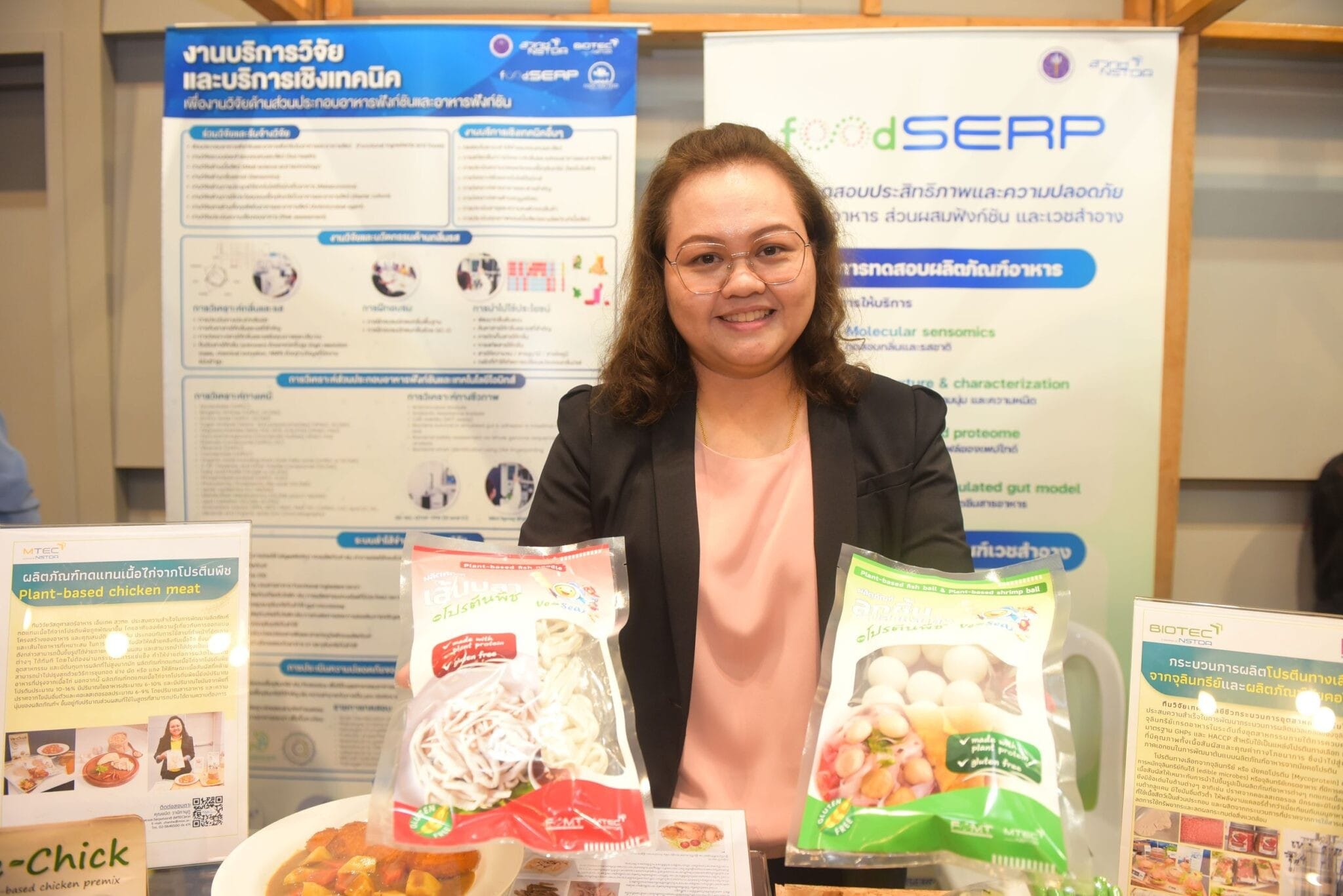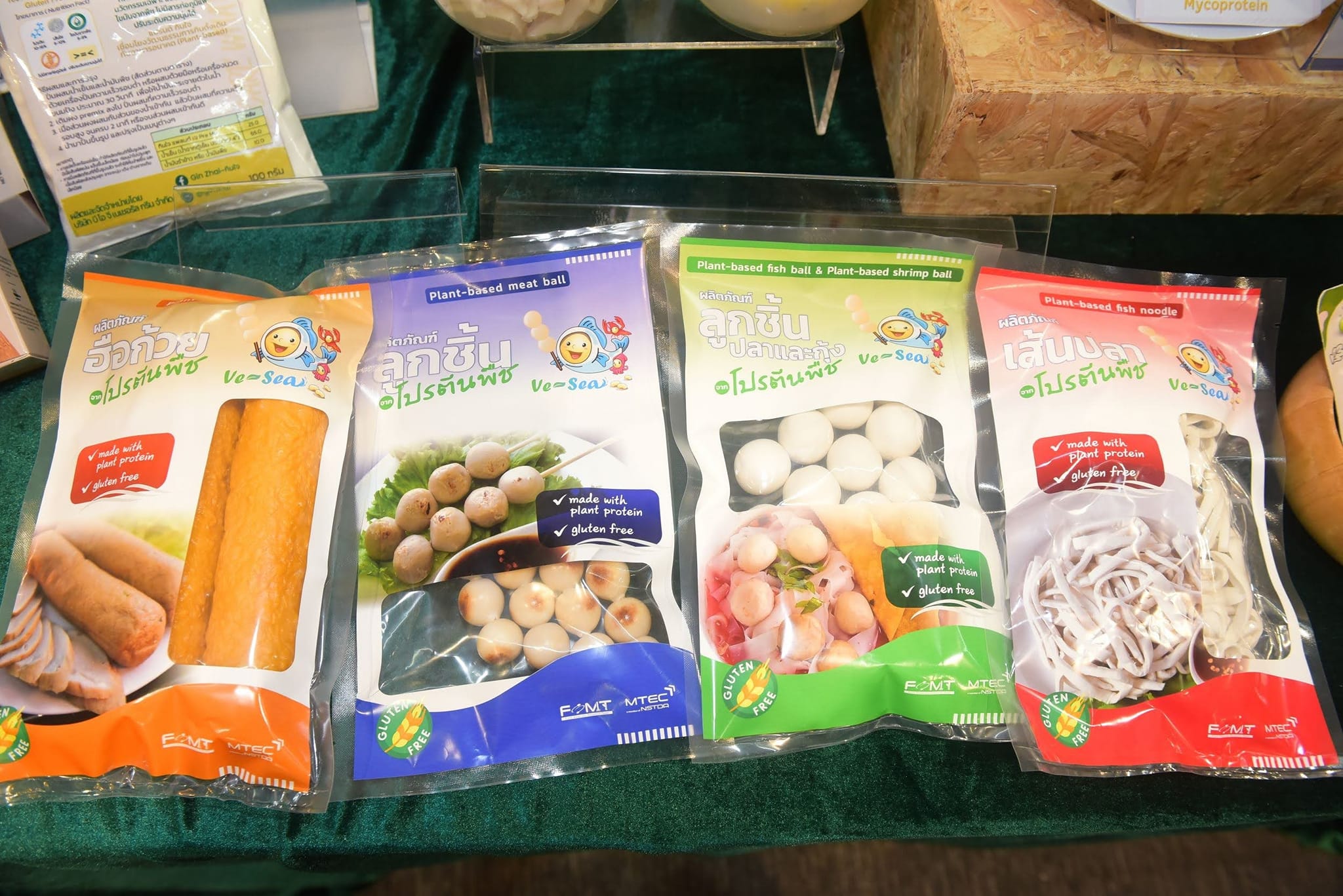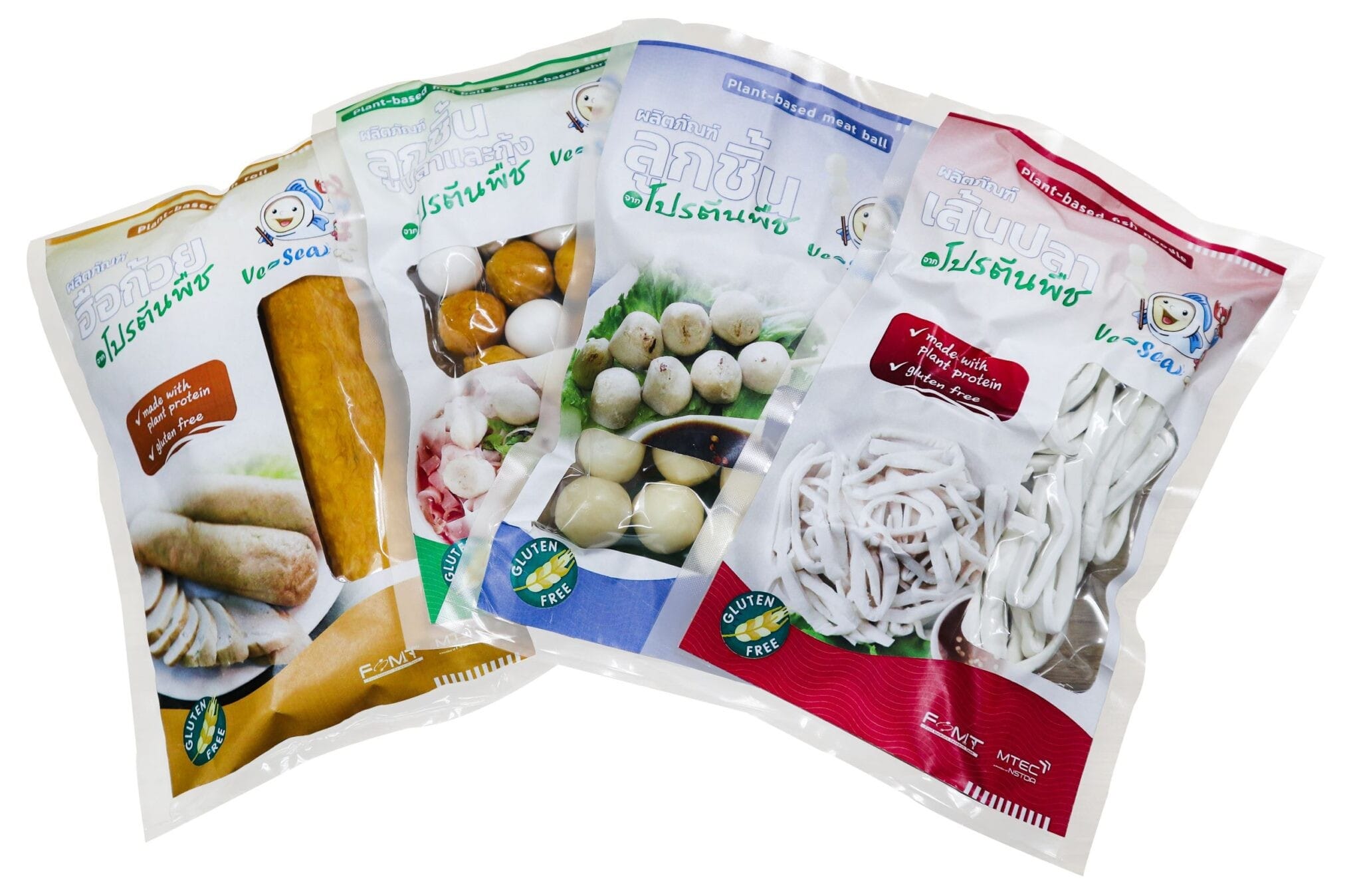 ดร. กมลวรรณ อิศราคาร นักวิจัยทีมวิจัยวัสดุศาสตร์อาหาร ศูนย์เทคโนโลยีโลหะและวัสดุแห่งชาติ (เอ็มเทค) สวทช. เปิดเผยว่า ทีมวิจัย FoodSERP สวทช. ได้พัฒนาผลิตภัณฑ์อาหารทะเลจากโปรตีนพืช ทั้งปลา หมึก และกุ้ง ด้วยเทคโนโลยีการออกแบบโครงสร้างอาหารที่อาศัยความรู้ทั้งทางด้านวัสดุศาสตร์และวิทยาศาสตร์การอาหารซึ่งเป็นความเชี่ยวชาญของทีมวิจัย ประกอบกับการใช้ความเข้าใจเกี่ยวกับหน้าที่ของวัตถุดิบแต่ละชนิดและเลือกผสมวัตถุดิบเข้าด้วยกัน ทำให้ทีมประสบความสำเร็จในการพัฒนาผลิตภัณฑ์อาหารทะเลจากโปรตีนพืชที่มีเนื้อสัมผัสและรสชาติใกล้เคียงกับเนื้อสัตว์จริงที่พร้อมถ่ายทอดเทคโนโลยีการผลิตในนาม ‘Ve-Sea’ เรียบร้อยแล้ว 3 ผลิตภัณฑ์ ได้แก่ ลูกชิ้นปลา เส้นปลา และฮือก้วย ซึ่งจากผลการทดสอบพบว่าผลิตภัณฑ์มีเนื้อสัมผัสใกล้เคียงของจริง อีกทั้งยังมีปริมาณโปรตีนเทียบเท่ากับผลิตภัณฑ์ทั่วไปที่ใช้เนื้อปลาเป็นส่วนประกอบด้วย สำหรับผลิตภัณฑ์เนื้อหมึกจากโปรตีนพืชคาดว่าจะเปิดตัวและพร้อมถ่ายทอดเทคโนโลยีภายในปี 2567