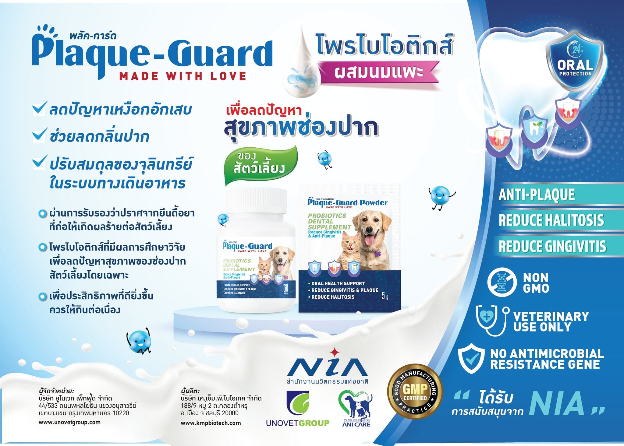 Plaque – Guard เป็นการคัดเลือกจุลินทรีย์โพรไบโอติก 4 สายพันธุ์ที่มีคุณสมบัติในการเกาะติดกับเนื้อเยื่อภายในช่องปากสุนัขได้ดี และสามารถยับยั้งการเจริญเติบโตของเชื้อก่อโรคปริทันต์อักเสบได้ มาพัฒนาต่อยอดให้อยู่ในรูปแบบเม็ดนมเสริมโพรไบโอติกสำหรับสุนัข เพื่อให้ได้ผลิตภัณฑ์ขนมสุขนัขที่สามารถช่วยลดการสะสมของคราบหินปูน และการอักเสบในเหงือกได้อย่างมีประสิทธิภาพ ทำให้เหล่าทาสไม่ต้องกังวลปัญหาในช่องปากของน้องหมาอีกต่อไป