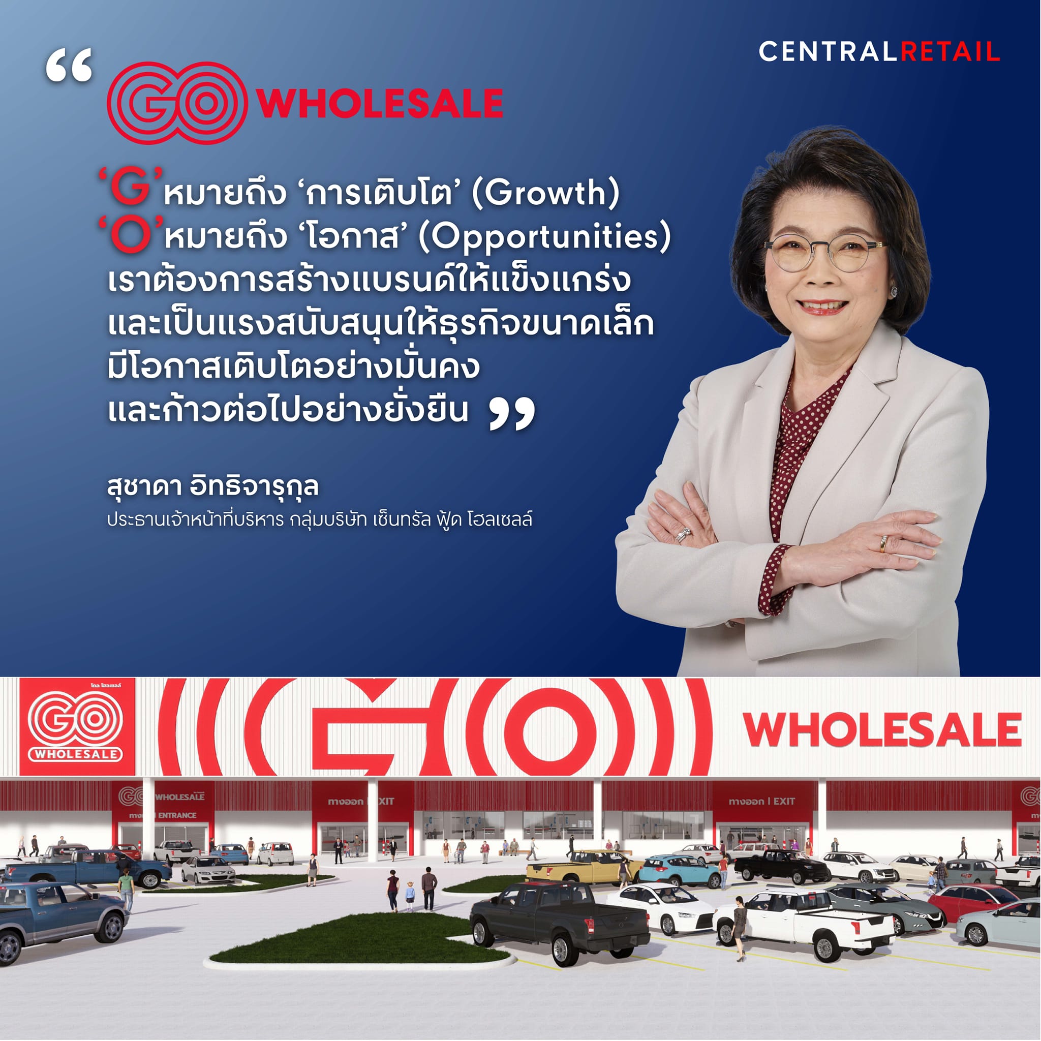 นางสุชาดา อิทธิจารุกุล ประธานเจ้าหน้าที่บริหาร กลุ่มบริษัท เซ็นทรัล ฟู้ด โฮลเซลล์ ธุรกิจในเครือ CRC เปิดเผยว่า ‘GO Wholesale’ คือศูนย์ค้าส่งสินค้าระบบสมาชิก ในราคาขายส่ง เพื่อผู้ประกอบการ ที่มีกลุ่มลูกค้าเป้าหมายหลักคือ กลุ่มธุรกิจโฮเรก้า (โรงแรม, ร้านอาหาร, ธุรกิจจัดเลี้ยง) กลุ่มผู้ชื่นชอบการทำอาหาร กลุ่มผู้ให้บริการอาหารในโรงงาน โรงพยาบาลและหน่วยงานอื่น ๆ รวมถึง ร้านค้าปลีกขนาดเล็ก (โชห่วย) โดยจุดเด่นคือการนำเสนอสูตรแห่งความสำเร็จให้แก่ผู้ประกอบการในด้านต่างๆ ที่ตอบโจทย์ความต้องการอย่างตรงใจ พร้อมเป็นแรงสนับสนุนให้เกิดการพัฒนาทักษะ และต่อยอดธุรกิจรายย่อยให้มีประสิทธิภาพ นำไปสู่การสร้างรายได้และผลกำไรให้เติบโตไปด้วยกัน เหมือนกับชื่อแบรนด์ GO ที่ ‘G’ หมายถึง ‘การเติบโต’ (Growth) และ ‘O’ หมายถึง ‘โอกาส’ (Opportunities) สอดคล้องไปกับแนวคิด ‘โตเร็ว โตไกล โตไปกับ GO’ หรือ Grow with GO ซึ่งเป็นโอกาสในการเติบโตไปด้วยกัน