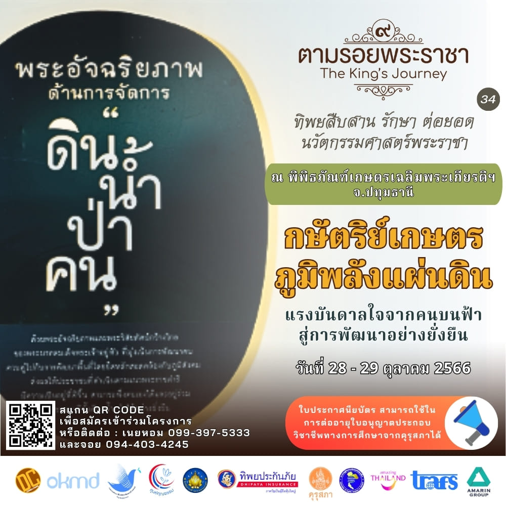 เชิญร่วมตามรอยพระราชาครั้งที่ ๓๔ ในวันเสาร์ที่ 28 – วันอาทิตย์ที่ 29 ตุลาคม 2566 (2 วัน 1 คืน) ณ พิพิธภัณฑ์การเกษตรเฉลิมพระเกียรติพระบาทสมเด็จพระเจ้าอยู่หัว จังหวัดปทุมธานี เปิดรับสมัครตั้งแต่วันนี้ เป็นต้นไป สอบถามข้อมูลเพิ่มเติมที่ คุณจารุกัญญ์ โทรศัพท์ 099 397 5333 FB : ตามรอยพระราชา-The King’s Journey LINE : The King’s Journey