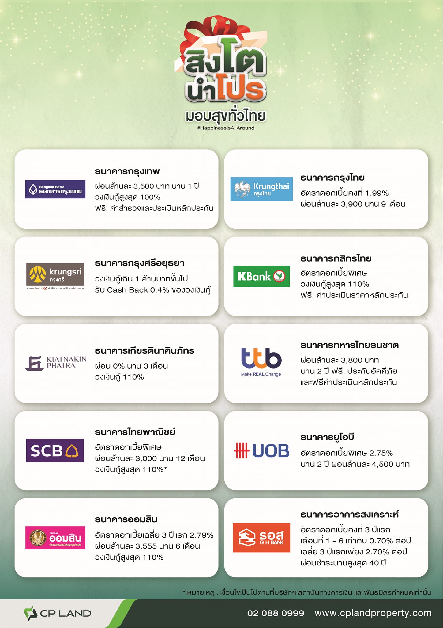 นอกจากนี้ คุณสิงโต นำโชค ศิลปินนักร้องชื่อดังในฐานะนักแสดงภาพยนตร์โฆษณา ‘ความสุขเกิดขึ้นได้ทุกที่รอบตัวคุณ’ โฆษณาชิ้นแรกของ CP LAND ได้กล่าวเชิญชวนเข้าร่วมแคมเปญ ‘สิงโต นำโปร’ ว่า ผมยินดีและดีใจเป็นอย่างมากที่ทาง CP LAND ให้ความไว้วางใจในการเลือกผมเป็นทั้งนักแสดงภาพยนตร์โฆษณา ผู้นำทัพแคมเปญ “CP LAND Presents เจอสุข เจอนั่น เจอนี่” ตลอดจนถึงตอนนี้กับแคมเปญโปรโมชัน ‘สิงโต นำโปร’ ผมจึงอยากเชิญชวนทุกท่านให้มาเข้าร่วมแคมเปญนี้ ซื้อโครงการบนทำเลคุณภาพดีจาก CP LAND กันครับ โดย 18 โครงการบ้านและคอนโดฯ จาก CP LAND ทั่วประเทศ ที่เข้าร่วมแคมเปญ ‘สิงโต นำโปร’ เริ่มต้นที่ 1.2 - 4.4 ล้านบาท มีดังนี้