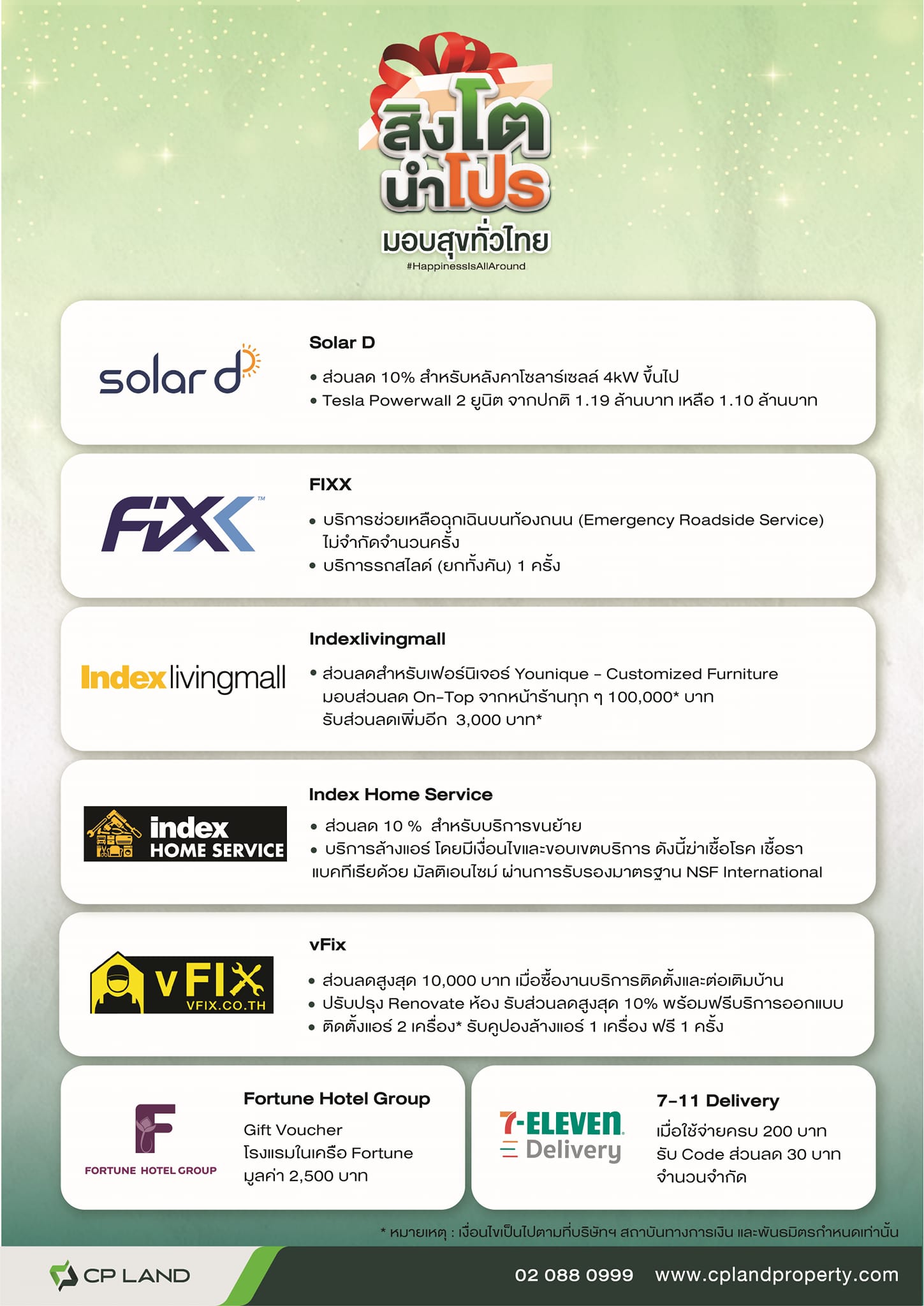 นางสาวศิริลักษณ์ จันทร ผู้อำนวยการฝ่ายวีฟิกซ์ (vFIX) บริษัท ซีอาร์ซี ไทวัสดุ จำกัด ในเครือเซ็นทรัล รีเทล กล่าวถึงความร่วมมือกับ CP LAND ว่า vFIX ในฐานะของทีมช่างมือ 1 ครบจบเรื่องบ้านให้บริการปรับปรุง ซ่อมแซม ตกแต่ง ต่อเติม ติดตั้ง ที่ปลอดภัยได้มาตรฐาน ซึ่งเป็นบริการเสริมภายใต้แบรนด์ไทวัสดุ และบีเอ็นบี โฮม รู้สึกดีใจอย่างยิ่งที่ได้ร่วมมือกับ CP LAND ในแคมเปญ ‘สิงโต นำโปร’ โปรโมชันดี ๆ เพราะวีฟิกซ์มองเห็นโอกาสต่อยอดและพัฒนาทางธุรกิจในเชิงการเติมเต็มซึ่งกันและกัน จึงขอมอบสิทธิพิเศษให้แก่ลูกค้า CP LAND อาทิ ส่วนลดสูงสุด 10,000 บาท* เมื่อซื้องานบริการติดตั้งและต่อเติมบ้าน, บริการสำรวจ เมื่อติดตั้งแผงโซลาร์เซลล์, ส่วนลด 5% เมื่อซื้อบริการต่อเติมโรงจอดรถ, ส่วนลดสูงสุด 10% ในการปรับปรุงห้อง (Renovate) พร้อมรับบริการออกแบบให้ฟรี, ติดตั้งผ้าม่านสั่งตัด รับส่วนลดสูงสุด 50% เมื่อซื้อบริการ 15,000 บาทขึ้นไป, ติดตั้งแอร์ 2 เครื่อง* รับคูปองล้างแอร์ 1 เครื่อง ฟรี 1 ครั้ง โดยต้องเป็นเครื่องปรับอากาศแบบ Wall Type ขนาดไม่เกิน 24,000 BTU