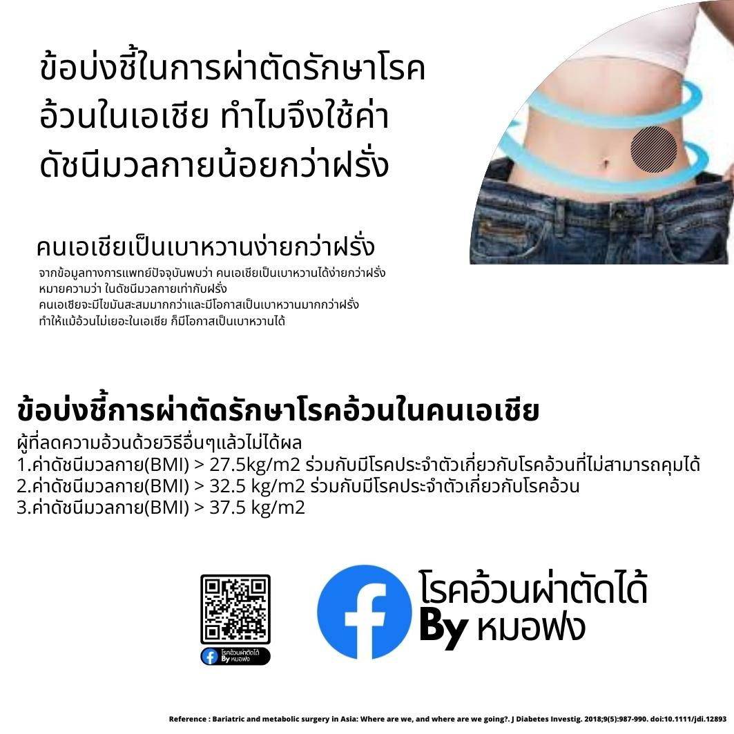 1. ค่าดัชนีมวลกาย (BMI) > 27.5 kg/m2 ร่วมกับมีโรคประจำตัวเกี่ยวกับโรคอ้วนที่ไม่สามารถควบคุมได้