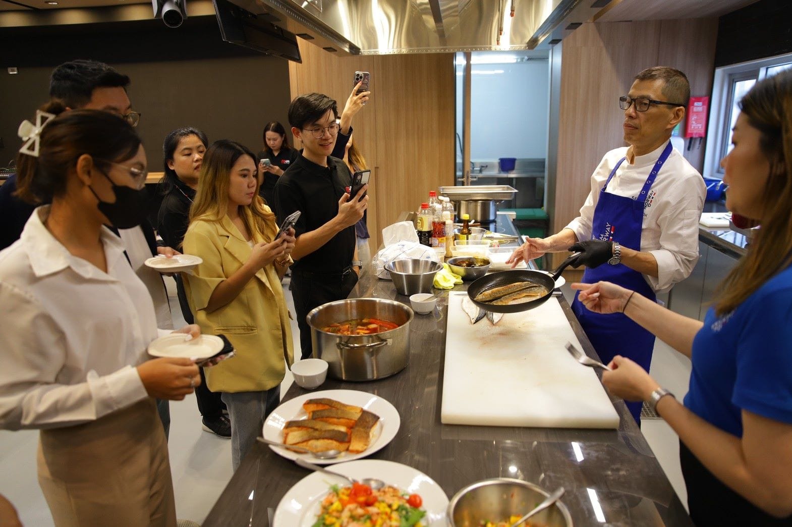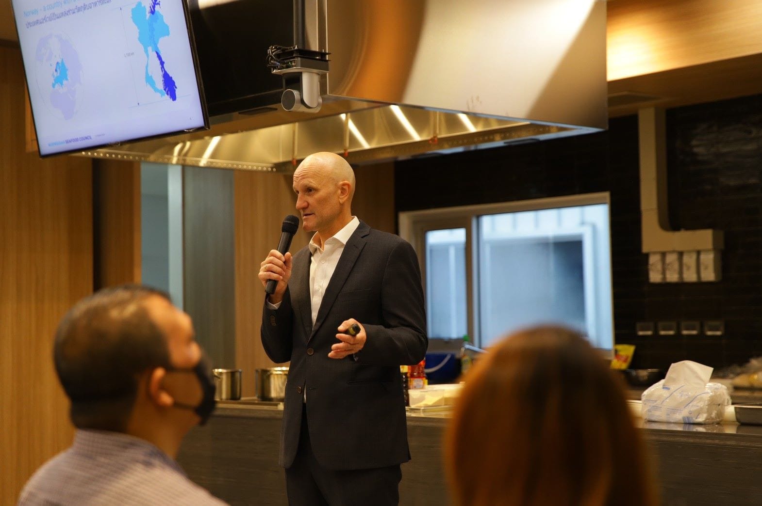 สภาอุตสาหกรรมอาหารทะเลนอร์เวย์ (NSC) นำโดย ดร. อัสบีเยิร์น วาร์วิค เรอร์ทเว็ท ผู้อำนวยการภูมิภาคเอเชียตะวันออกเฉียงใต้ (ที่ 2 จากซ้าย) สนับสนุนจาก บริษัท ซีพี แอ็กซ์ตร้า จำกัด (มหาชน) นำโดย นาง เอกธิดา เสรีรัตน์วิภาชัย ผู้อำนวยการฝ่ายบริหารสินค้าอาหารสด (ที่ 3 จากซ้าย) พร้อมด้วย แม็คโคร โฮเรก้า อคาเดมี (MHA) นำโดย นางสาว ณัฎฐินี ปลอดทอง ผู้จัดการอาวุโส แม็คโคร โฮเรก้า อคาเดมี (MHA) (ที่ 4 จากซ้าย) จัดฝึกอบรม ‘EATucation - The Culinary Showcase’ เป็นครั้งแรกในประเทศไทย ร่วมกับ เชฟ จิมมี่ ช๊ก เชฟกิตติมศักดิ์ของ Seafood from Norway (ที่ 1 จากซ้าย) ณ The Food School กิจกรรมนี้มีวัตถุประสงค์เพื่อยกระดับมาตรฐานอุตสาหกรรมอาหารทะเลในประเทศไทย