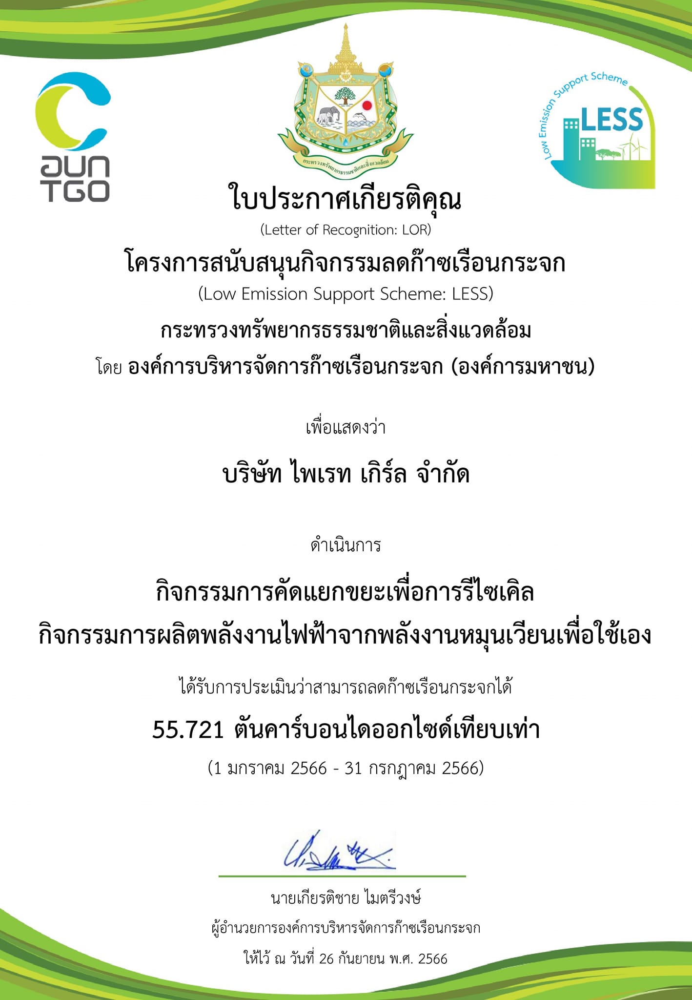 “ทั้งนี้ บลูทรี ภูเก็ต ยังเข้าร่วมโครงการ สนับสนุนกิจกรรมลดก๊าซเรือนกระจก (LESS) กระทรวงทรัพยากรธรรมชาติและสิ่งแวดล้อม โดย องค์การบริหารจัดการก๊าซเรือนกระจก (อบก.) เพื่อประเมินปริมาณก๊าซเรือนกระจกที่ลดได้ โดยในปี 2565 ลดปริมาณการปล่อยก๊าซเรือนกระจกไปได้ 38.315 ตันคาร์บอนไดออกไซด์เทียบเท่า จากกิจกรรมการคัดแยกขยะเพื่อการรีไซเคิล และปี 2566 ลดปริมาณการปล่อยก๊าซเรือนกระจกไปได้ 55.721 ตันคาร์บอนไดออกไซด์เทียบเท่า จากกิจกรรมการคัดแยกขยะเพื่อการรีไซเคิลและกิจกรรมการผลิตพลังงานไฟฟ้าจากพลังงานหมุนเวียนเพื่อใช้เอง”