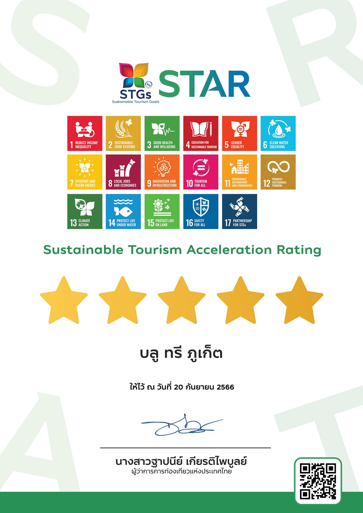 สำหรับ ยุทธศาสตร์ STGs เป็นการพัฒนาแนวคิดมากจากเป้าหมายการพัฒนาที่ยั่งยืน (Sustainable Development Goals : SDGs) 17 เป้าหมายขององค์การสหประชาชาติ นำมาปรับใช้ให้เข้ากับบริบทการท่องเที่ยวไทย โดยบลูทรี ภูเก็ต สามารถพิชิตได้ถึง 12 เป้าหมาย ซึ่งประกอบไปด้วย