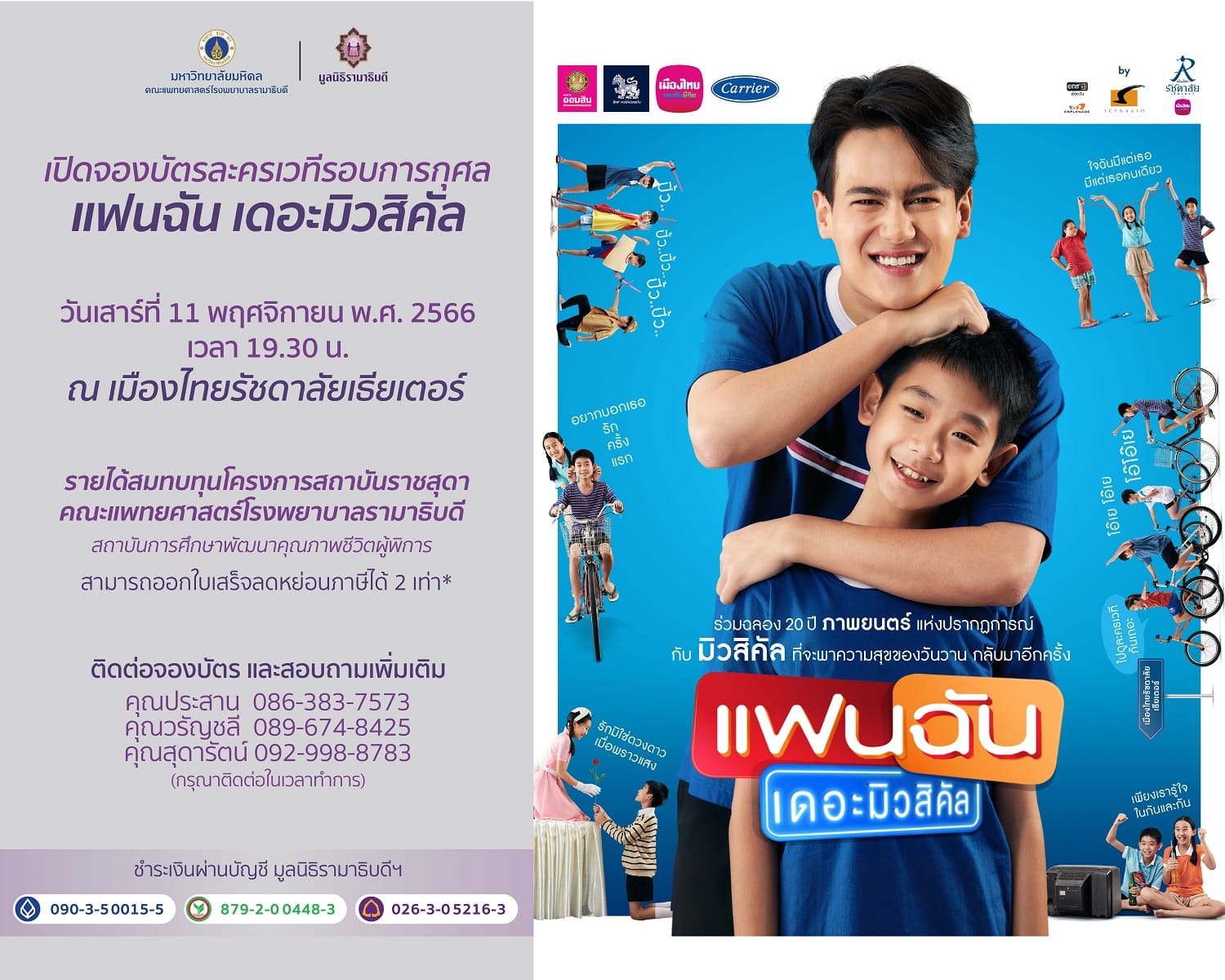 “ในการเปิดตัว โครงการทุนสถาบันราชสุดา คณะแพทยศาสตร์โรงพยาบาลรามาธิบดี ครั้งนี้ มูลนิธิรามาธิบดีฯ ได้ร่วมมือกับบริษัท ซีเนริโอ จำกัด ซึ่งเล็งเห็นความสำคัญของการ “ให้” โอกาสทางการศึกษาแก่คนพิการในสังคมไทยจัดรอบการแสดงละครเวทีการกุศล “แฟนฉัน เดอะมิวสิคัล” ขึ้นในวันเสาร์ที่ 11 พฤศจิกายน 2566 เวลา 19:30 น.