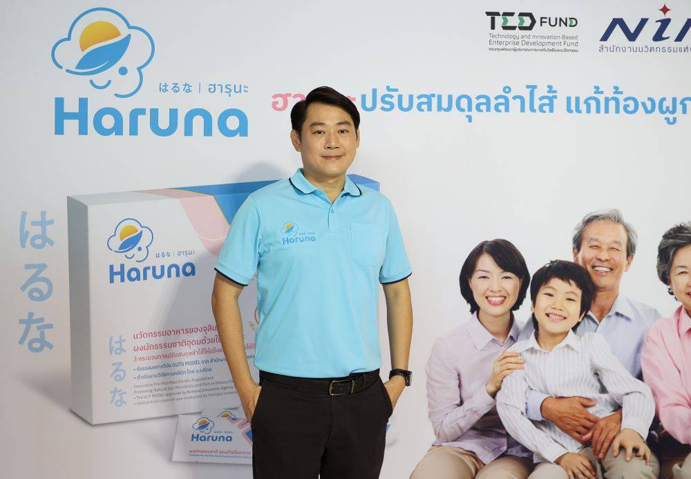 “โดยบริษัทฯ ได้ร่วมมือกับ NIA นำ Haruna ผงผักพรีไบโอติก เข้ารับการวิจัยลำไส้จำลอง (Guts Model) จึงพบว่า Haruna ผงผักพรีไบโอติก มี “นวัตกรรม 3P” คือ ฮารุนะเป็นพรีไบโอติก อาหารจุลินทรีย์ ที่สร้างโพรไบโอติก ที่เป็นจุลินทรีย์สายพันธุ์สำคัญในลำไส้ถึง 9 กลุ่ม และได้เจริญเติบโตแบบทวีคูณ ส่งผลต่อการสร้างกรดไขมันห่วงโซ่สั้น หรือ โพสไบโอติก ที่สมดุลในลำไส้ ทำให้ลำไส้แข็งแรง ซึ่งสามารถแก้ปัญหาท้องผูกได้ 98.4%” จึงทำให้มั่นใจว่า Haruna ผงผักพรีไบโอติก สามารถแก้ปัญหาท้องผูกของทุกคนในประเทศไทยได้”
