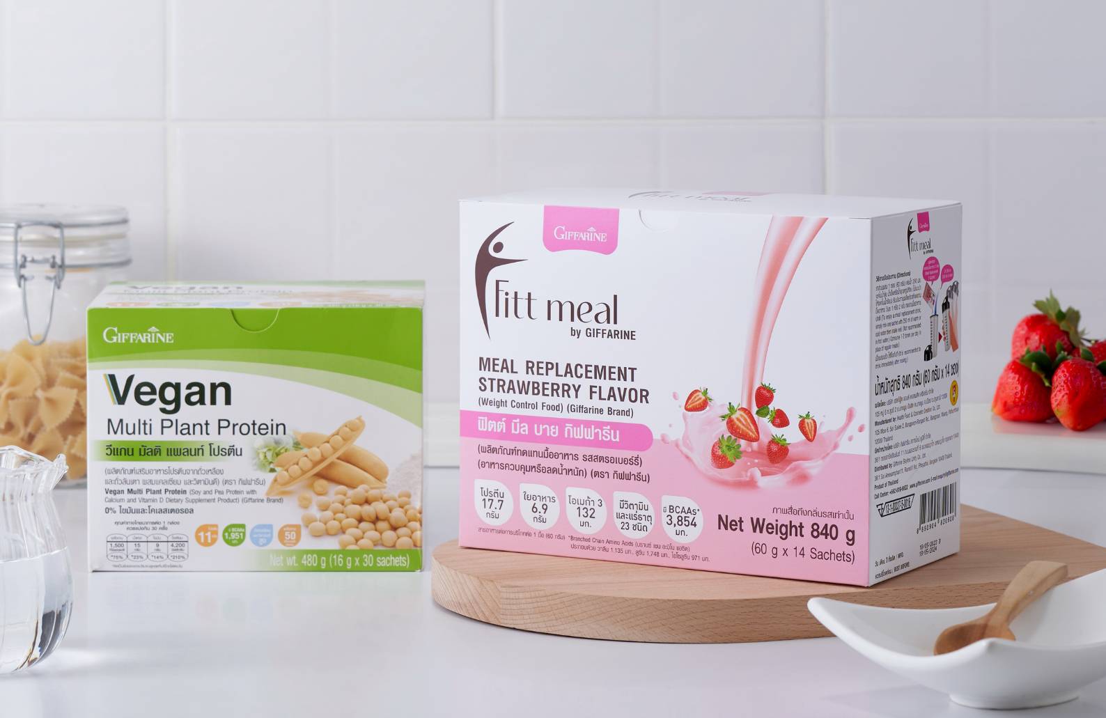 หากคุณมองหาตัวช่วยดีๆ เพื่อช่วยควบคุมและลดน้ำหนักด้วยผลิตภัณฑ์ทดแทนมื้ออาหารที่ถูกต้องตามหลักโภชนาการ ให้สารอาหารครบ 5 หมู่ มีวิตามินและเกลือแร่ที่จำเป็นต่อร่างกาย ทานร่วมกับผลิตภัณฑ์โปรตีนจากพืช ที่มีประโยชน์ต่อร่างกาย กิฟฟารีนผู้นำแบรนด์สุขภาพและความงามสัญชาติไทย พร้อมดูแลด้วยผลิตภัณฑ์ทดแทนมื้ออาหารและผลิตภัณฑ์เสริมอาหารโปรตีนจากถั่วเหลือง และถั่วลันเตา ที่ทานได้ทุกวัน ตอบโจทย์เรื่องสุขภาพ ทั้ง “Fitt Meal by Giffarine (ฟิตต์ มีล บาย กิฟฟารีน)” ผลิตภัณฑ์ทดแทนมื้ออาหาร และ “Giffarine Vegan Multi Plant Protein (กิฟฟารีน วีแกน มัลติ แพลนท์ โปรตีน)” แนะนำให้รับประทานคู่กันแทนอาหาร 1 มื้อ