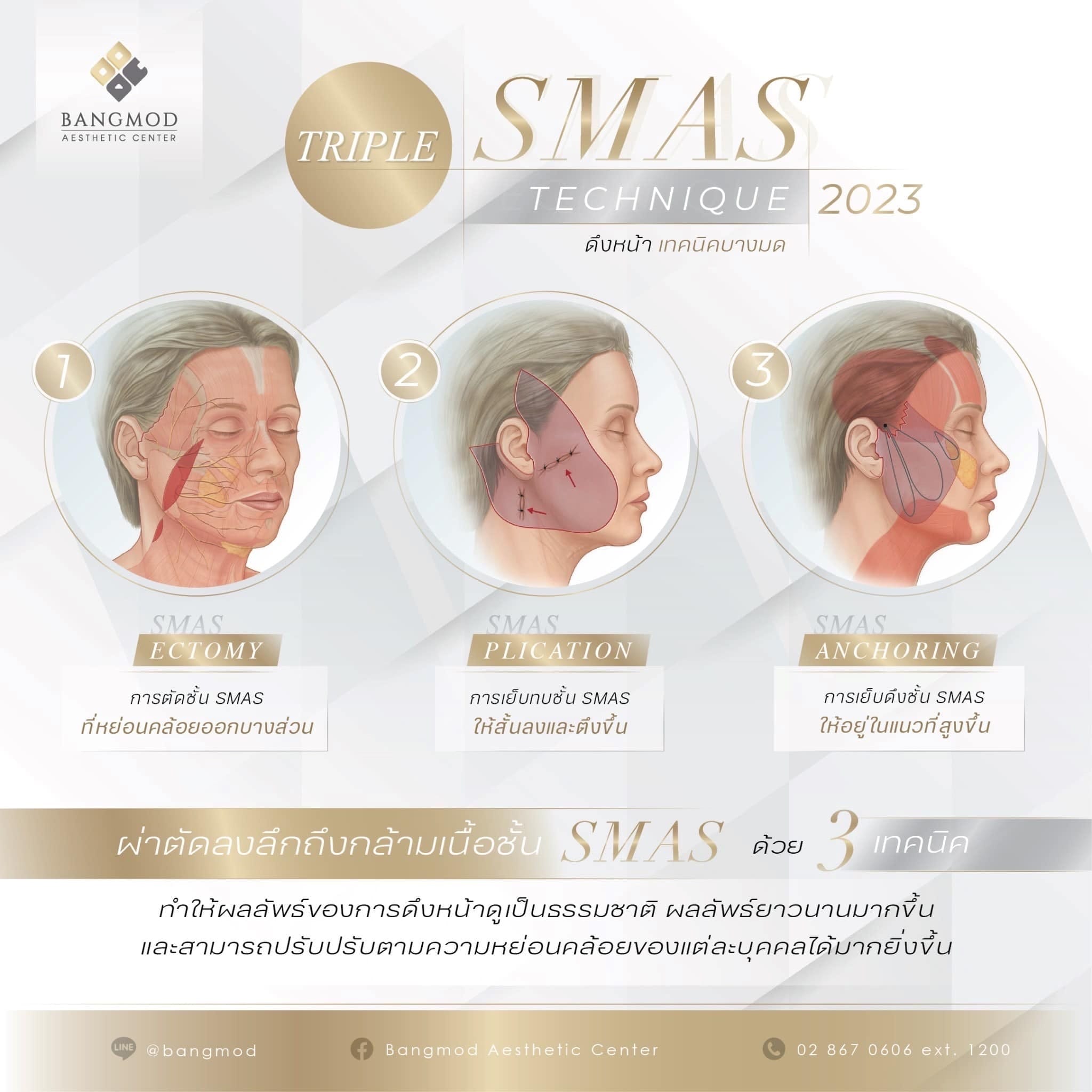 เทรนด์ที่ 4 ผลลัพธ์ที่ดีที่สุดของการทำศัลยกรรมดึงหน้า ไม่ใช่ทำให้หน้าตึงขึ้นเพียงอย่างเดียว แต่ต้องทำให้ใบหน้าดูมีความเป็นธรรมชาติมากที่สุด ซึ่งศูนย์ศัลยกรรมความงามโรงพยาบาลบางมด ได้คิดค้นพัฒนาเทคนิคเฉพาะในการศัลยกรรมดึงหน้า เรียกว่า New Modern Facelift 2023 ถือเป็นขั้นกว่าของการศัลยกรรมดึงหน้าด้วย 4 เทคนิคพิเศษ ได้แก่ การผ่าตัดดึงหน้าในชั้นกล้ามเนื้อระดับ SMAS ได้ผลลัพธ์ที่ดียิ่งขึ้น เพราะเพิ่มเทคนิคการเย็บที่ชั้น SMAS มากขึ้น ถึง 3 เทคนิค (Triple SMAS technique) ได้แก่ SMAS plication การเย็บทบชั้น SMAS ให้สั้นลงและตึงขึ้น, SMASectomy การตัดเย็บชั้น SMAS ที่หย่อนคล้อยออกบางส่วน และ SMAS anchoring การเย็บดึงชั้น SMASให้อยู่ในแนวที่สูงขึ้น