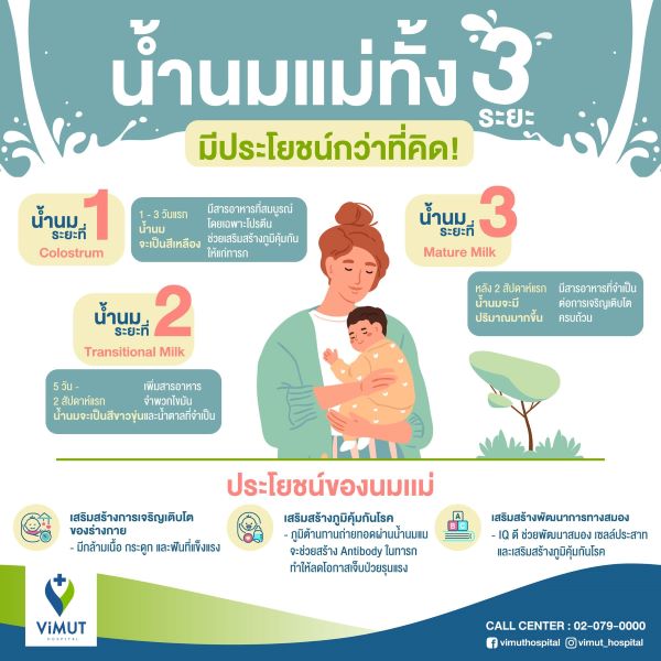 นมแม่เป็นอาหารที่ดีและเหมาะสมที่สุดสำหรับเด็กทารก เนื่องจากมีสัดส่วนสารอาหารที่เหมาะในการย่อยและดูดซึมสำหรับทารก ซึ่งนอกจากเจ้าตัวเล็กจะได้สารอาหารเพียงพอ ยังช่วยให้ย่อยอาหารและดูดซึมง่าย เสริมภูมิต้านทาน ช่วยลดการติดเชื้อทางเดินหายใจและทางเดินอาหาร นอกจากนี้เด็กที่ดื่มน้ำนมแม่จะน้ำหนักขึ้นเร็ว แถมยังช่วยเสริมสร้าง EQ กับ IQ ให้กับเด็กด้วย พญ. วรรัตน์ โกวิทจินดาชัย อธิบายเสริมว่า "คุณแม่ทุกคนควรให้น้ำนมแม่อย่างเดียวในช่วง 6 เดือนแรก เพราะน้ำนมแม่จะปรับสารอาหารให้เหมาะกับช่วงอายุของลูก โดยแบ่งออกเป็น 3 ระยะ ได้แก่ น้ำนมระยะที่ 1 (Colostrum) จะหลั่งออกมาในช่วงประมาณ 1-3 วันหลังคลอด มีพลังงานและภูมิต้านทานสูง ช่วยกระตุ้นให้ลำไส้ขับถ่ายง่าย ต่อมาในน้ำนมระยะที่ 2 (Transitional Milk) จะหลั่งออกมาในช่วงสัปดาห์แรกถึงสัปดาห์ที่สอง น้ำนมในช่วงนี้จะสะสมโปรตีน วิตามิน รวมถึงพลังงานอื่น ๆ ที่จำเป็นต่อทารก สุดท้ายคือน้ำนมระยะที่ 3 (Mature Milk) เป็นน้ำนมที่หลั่งออกมาหลัง 2 สัปดาห์ และสามารถให้ต่อเนื่องได้ถึง 6 เดือน โดยปริมาณจะเพิ่มขึ้นเรื่อย ๆ และสัดส่วนของสารอาหารในน้ำนมแม่สอดคล้องกับการเติบโตของลูกน้อยของเรา"