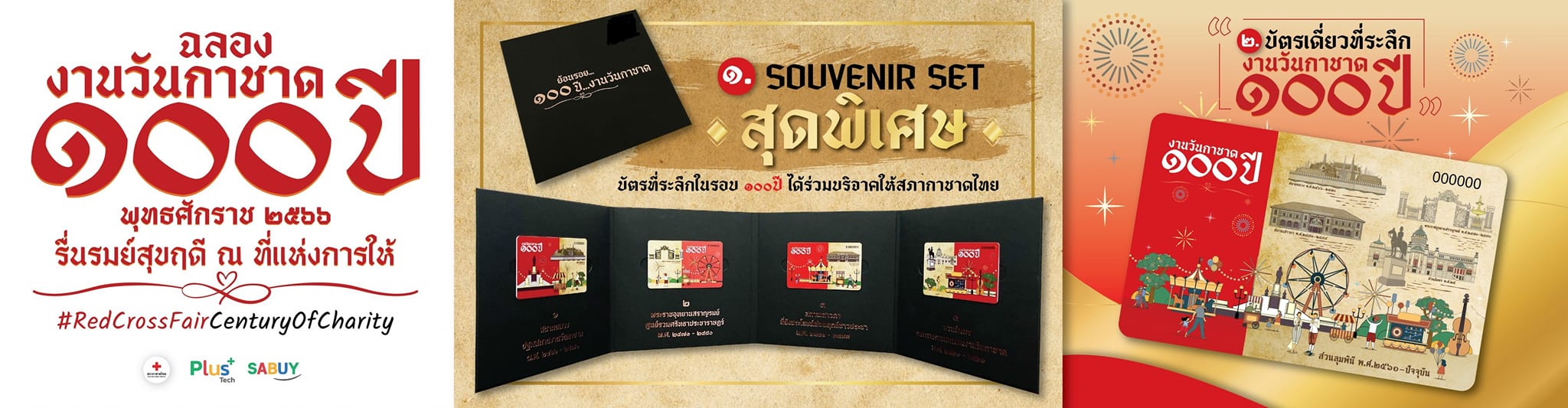 ผู้ที่สนใจบัตรที่ระลึกงานวันกาชาด ๑๐๐ ปี สามารถสั่งซื้อได้แล้วตั้งแต่วันนี้ ทางออนไลน์ Link : https://shop.plustech.co.th/ และที่จุดจำหน่ายบัตร ทั้งหมด ๑๑ จุด ภายในงานกาชาด ณ สวนลุมพินี