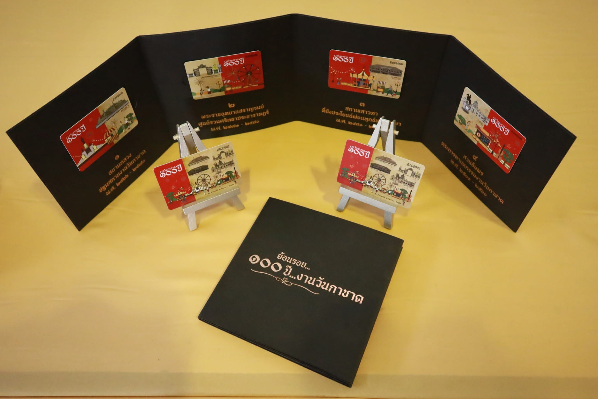 บัตรที่ระลึกงานวันกาชาด ๑๐๐ ปี ผลิตและจัดจำหน่าย โดยพลัส เทคฯ ในเครือกลุ่มบริษัทสบายฯ มีการจัดทำ ๒ รูปแบบ ดังนี้
