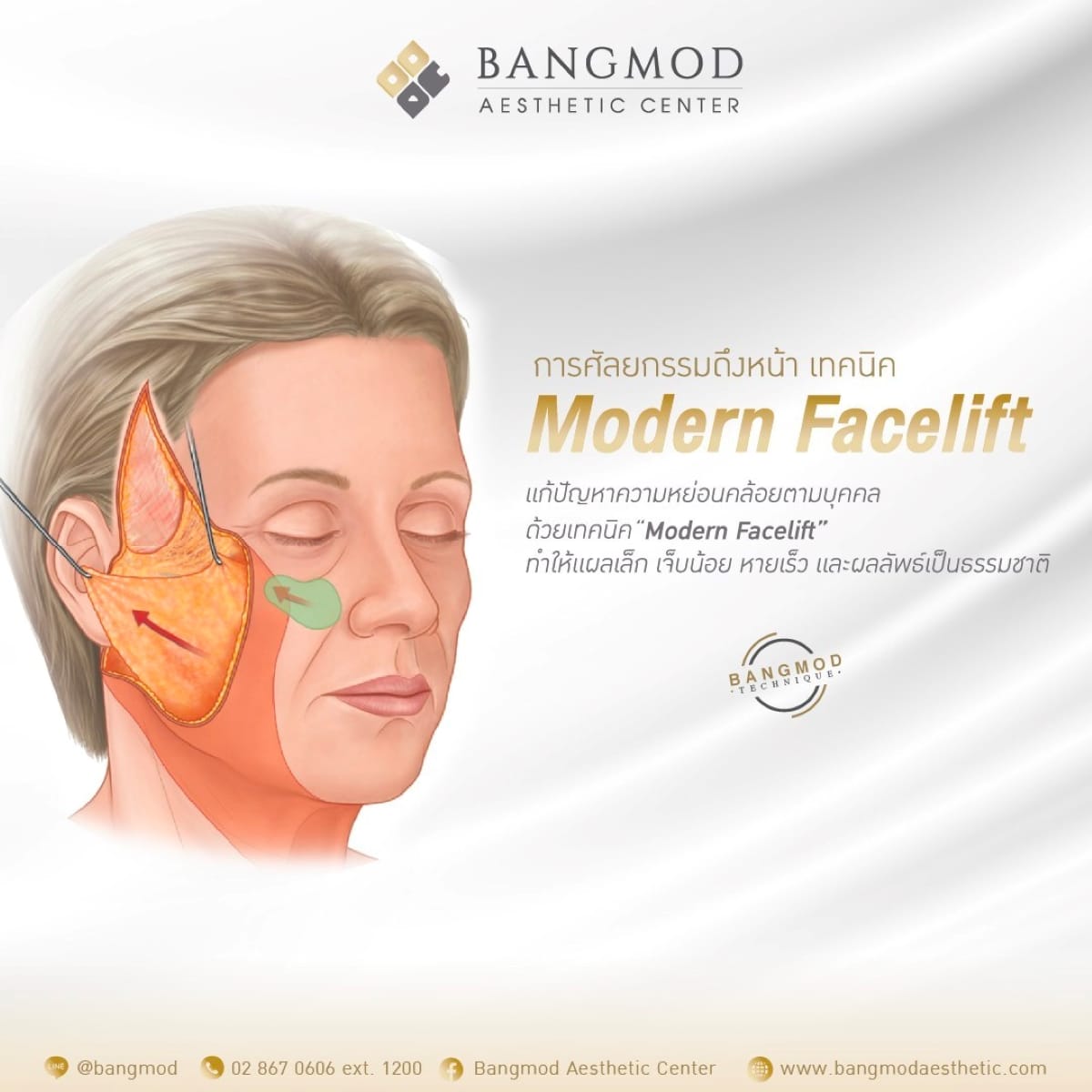 โดยใน ศาสตร์ที่ 1 ศัลยกรรมความงาม (ศัลยกรรมดึงหน้า) ทางศูนย์ศัลยกรรมความงามโรงพยาบาลบางมด ได้ประยุกต์ข้อดีของเทคนิคการผ่าตัดดึงหน้าตั้งแต่อดีตจนถึงปัจจุบัน กลายมาเป็น Modern Facelift เทคนิคการดึงหน้าให้ดูเป็นธรรมชาติมากขึ้น ซึ่งแพทย์จะตรวจประเมินความหย่อนคล้อยของใบหน้าด้วยเทคนิค Grading ก่อนทำการผ่าตัดในผิวหนังชั้นลึกขึ้น ที่เรียกว่าชั้นสแมช (SMAS) ดึงหน้าได้ 4 ส่วน ได้แก่ บริเวณหน้าผาก (Forehead lift) ใบหน้าส่วนบนและหางตา (Upper Facelift, Temporal lift) ใบหน้าส่วนกลางและส่วนล่าง (Lower Facelift) รวมทั้งลำคอ (Neck lift) นอกจากนี้ ยังมีการผสมผสานการฉีดไขมันของตัวเอง (Fat Grafting) ผสานสารสกัดพลาสม่า (PRP) ทั่วใบหน้า เพื่อให้ผลลัพธ์ดูเป็นธรรมชาติ และคงความอ่อนเยาว์มากยิ่งขึ้น