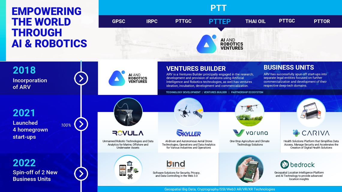 ในช่วงเวลา 5 ปี หลังก่อตั้ง ARV ซึ่งเป็นบริษัทลูกภายใต้กลุ่ม ปตท.สผ. ที่ริเริ่มมาจากกลุ่มคนที่สนใจในเรื่องการพัฒนาเทคโนโลยีด้าน AI และหุ่นยนต์ สิ่งที่ ARV ตั้งใจพัฒนาต่อจากนี้ให้แข็งแกร่งยิ่งขึ้น คือ การเป็น Ventures Builder ที่สร้างสตาร์ตอัปที่พัฒนาเทคโนโลยี AI และหุ่นยนต์ ภายใต้ ARV ซึ่งปัจจุบันมีทั้งหมด 6 สตาร์ตอัปพร้อมทั้งมีพนักงานราวๆ 400 คนแล้ว ได้แก่ 1. ROVULA (โรวูล่า) พัฒนาหุ่นยนต์ใต้ทะเล เพื่อใช้ในเรื่องการสำรวจและการซ่อมบำรุงท่อใต้น้ำ 2. SKYLLER (สไกเลอร์) พัฒนาเทคโนโลยีโดรนหรือหุ่นยนต์เพื่อเก็บข้อมูลต่างๆ และนำ AI มาวิเคราะห์ ในมุมของ Assistant maintenance 3. VARUNA (วรุณา) พัฒนาเทคโนโลยีทางการเกษตร (Agriculture Tech) และเทคโนโลยีที่ควบคุมหรือลดการปล่อยก๊าซเรือนกระจก (Climate Technology) ผ่านการใช้ข้อมูลดาวเทียมมาวิเคราะห์เพื่อหาคาร์บอนที่กักเก็บอยู่ในป่าและเปลี่ยนเป็นคาร์บอนเครดิต 4. CARIVA (แคริว่า) พัฒนา Health Digital Solution ร่วมกับเทคโนโลยีด้าน AI เพื่อยกระดับการทำงานทางการแพทย์ในมุมของการวินิจฉัยและวิเคราะห์โรค 5. BIND (ไบนด์) พัฒนาเทคโนโลยีบล็อกเชนเพื่อพิสูจน์ และยืนยันตัวตน และทำธุรกรรมออนไลน์ต่างๆ และ 6. BEDROCK (เบดร็อค) พัฒนาแพลตฟอร์มเทคโนโลยีด้านโลเคชัน โดยใช้ข้อมูลในเชิงด้านภูมิศาสตร์สารสนเทศ เข้ามาวิเคราะห์ให้บริการในอุตสาหกรรม เช่น ปัจจุบันมีการให้บริการแพลตฟอร์มเรื่อง Smart City กับเทศบาลในประเทศไทย