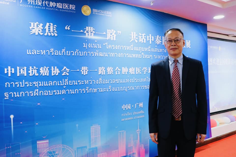 นอกจากนั้น โรงพยาบาลมะเร็งสมัยใหม่กว่างโจวสแตมฟอร์ด ยังอยู่ท่ามกลางสิ่งแวดล้อมที่ดีและสวยงามบนเชิงเขาป๋ายหยุน เมืองกว่างโจว สาธารณรัฐประชาชนจีน ซึ่งการมีสภาพแวดล้อมที่ดีและสวยงามจะช่วยให้ผู้ป่วยมีสุขภาพจิตดี ผู้ป่วยสามารถพักฟื้นที่โรงพยาบาลได้อย่างอบอุ่นและสบายใจ ในพื้นที่ก่อสร้างรวม 20,000 ตารางเมตร ภายใต้การดูแลของพนักงานมากกว่า 500 คน เรามีความร่วมมือกันทางด้านการแพทย์กับสิงคโปร์ในการให้การรักษาผู้ป่วยมะเร็งทั่วโลกความร่วมมือระหว่างประเทศกับสถาบันทางการแพทย์และสถาบันวิจัยในต่างประเทศมากกว่า 20 แห่ง และร่วมมือกับโรงพยาบาลนานาชาติหลายแห่งทั่วโลก เช่น เวียดนาม อินโดนีเซีย ฟิลิปปินส์ บังคลาเทศ กัมพูชา ไทย มาเลเซีย รวมทั้งตะวันออกกลาง โดยได้ตั้งศูนย์ให้คำปรึกษา 10 แห่งในต่างประเทศ รวมถึงสาขาในกรุงเทพมหานครแห่งนี้ เพื่อให้คำปรึกษาแก่ผู้ป่วยมะเร็งที่เรามีความรู้ความเชี่ยวชาญโดยเฉพาะ” นายหวัง กล่าว