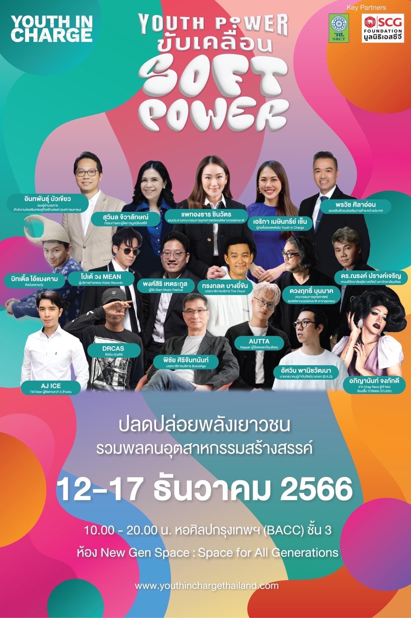 "Youth In Charge" ชวนค้นหาคำตอบได้ที่งาน “Youth Power ขับเคลื่อน Soft Power” ภายใต้แนวคิด “ปลดปล่อยพลังเยาวชน รวมพลคนอุตสาหกรรมสร้างสรรค์” กับเวทีกลางให้เยาวชนไทยได้นำเสนอความคิดเห็นถึงกระบวนการขับเคลื่อนซอฟต์พาวเวอร์ในมุมมองของคนรุ่นใหม่ ร่วมกับหน่วยงานจากทุกภาคส่วนที่มีบทบาทในการขับเคลื่อนซอฟต์พาวเวอร์ เพื่อเป็นจุดเริ่มต้นเล็ก ๆ สู่ก้าวที่ยิ่งใหญ่ในการขับเคลื่อนซอฟต์พาวเวอร์ไทยสู่สากล โดยกำหนดจัดในวันที่ 12-17 ธันวาคม นี้ ณ ห้อง New Gen Space: Space for All Generations ชั้น 3 หอศิลปวัฒนธรรมแห่งกรุงเทพมหานคร (BACC)