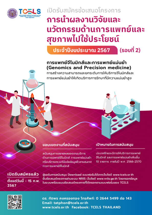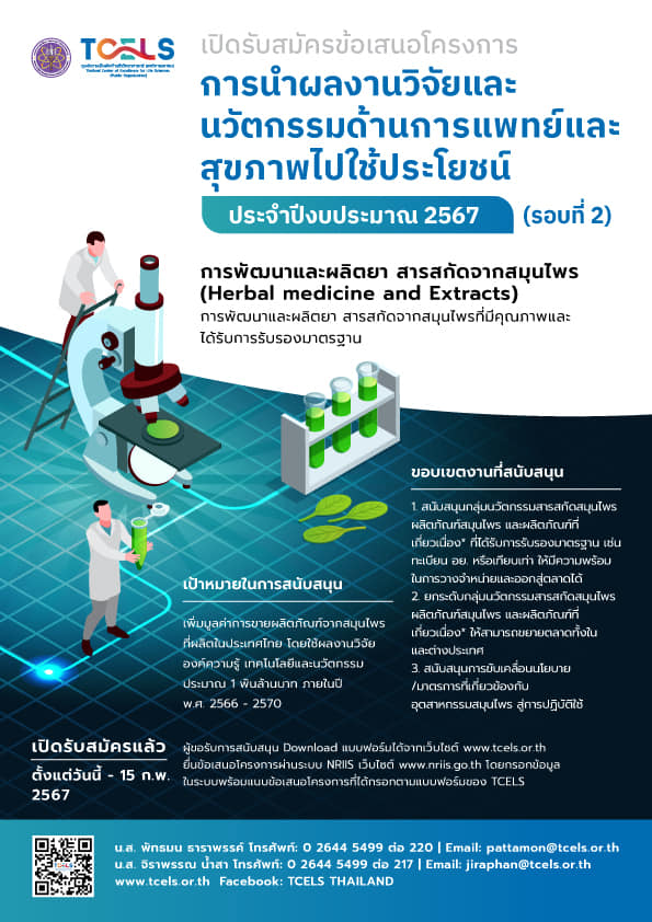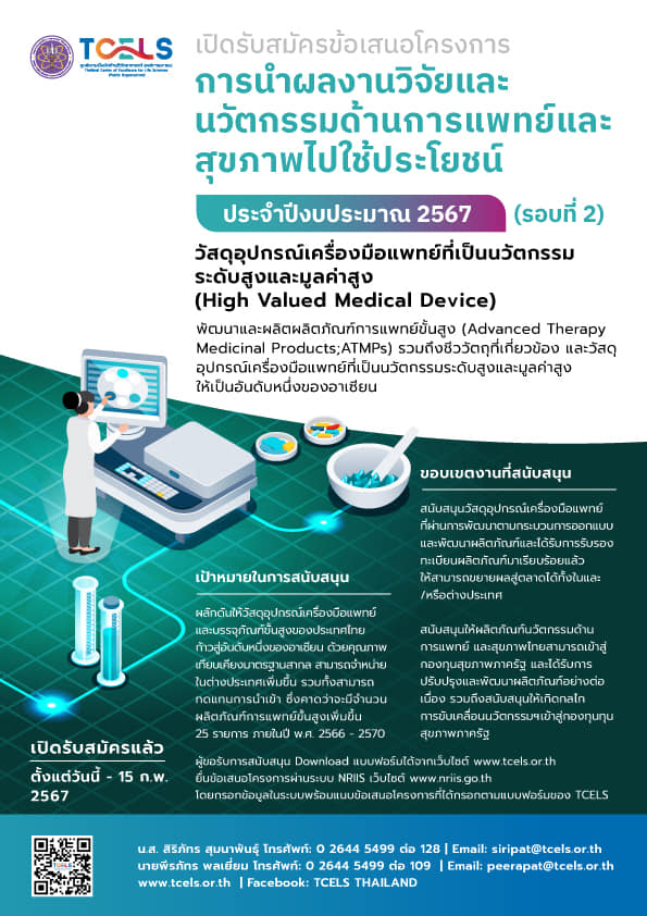 ศูนย์ความเป็นเลิศด้านชีววิทยาศาสตร์ (องค์การมหาชน) หรือ TCELS เปิดรับสมัครข้อเสนอโครงการการนำผลงานวิจัยและนวัตกรรมด้านการแพทย์และสุขภาพไปใช้ประโยชน์ (Research Utilization : RU) ประจำปีงบประมาณ 2567 รอบที่ 2 ตั้งแต่วันนี้ถึงวันที่ 15 กุมภาพันธ์ 2567 โดยมีวัตถุประสงค์เพื่อขับเคลื่อนเศรษฐกิจ เพิ่มขีดความสามารถของเอกชน มุ่งสู่เศรษฐกิจฐานนวัตกรรม ยกระดับห่วงโซ่อุตสาหกรรมเป้าหมาย เชื่อมต่อและกระจายสู่เศรษฐกิจฐานราก โดยเปิดรับข้อเสนอโครงการจาก 3 อุตสาหกรรมเป้าหมาย ประกอบด้วย