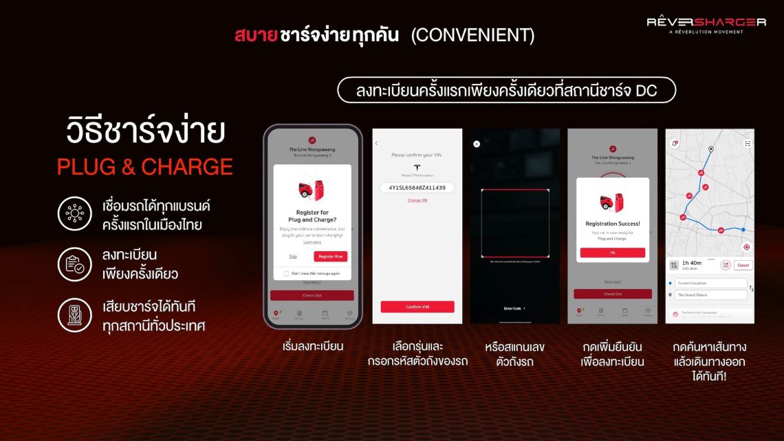 3.สบายชาร์จง่ายทุกคัน (Convenient) ออกแบบบริการก่อนการชาร์จ ระหว่างการชาร์จ และหลังการชาร์จ ด้วยการนำเทคโนโลยีที่มีการใช้งานในระดับโลก มาต่อยอดกับบริการของ RÊVERSHARGER เพื่อให้ผู้บริโภคสบาย ใช้ง่ายในทุกขั้นตอน อาทิ Trip Planning ใช้แผนที่จาก Google Maps เชื่อมโยงเข้าสู่แอป RÊVERSHARGER เพื่อให้ผู้ใช้งานสามารถค้นหาเส้นทางจากจุดเริ่มต้นไปยังจุดหมายปลายทาง พร้อมทั้งแนะนำสถานีชาร์จรถยนต์ไฟฟ้า ที่อยู่บนเส้นทางหรือบริเวณใกล้เคียงการเดินทางไปยังจุดหมาย อำนวยความสะดวกให้หาจุดชาร์จได้ง่ายและเดินทางได้อย่างมั่นใจ, Plug & Charge สร้างประสบการณ์ใหม่ให้ลูกค้า ด้วยวิธีชาร์จที่ง่ายดายยิ่งขึ้น เพียงลงทะเบียนเข้าใช้งานครั้งแรกครั้งเดียวที่สถานีชาร์จ เพื่อบันทึกข้อมูลแบรนด์และรุ่นของรถ รวมถึงช่องทางชำระเงินในฐานข้อมูล ให้ผู้ใช้งานสามารถนำหัวชาร์จเสียบเข้ากับรถ EV เพื่อเติมพลังงานได้ทุกแบรนด์รถเป็นครั้งแรกในไทย และชำระค่าบริการได้อัตโนมัติเมื่อชาร์จเสร็จในครั้งต่อไปได้ทุกสถานีในเครือข่าย, Wallet and Privilege ชำระเงินได้ง่าย ด้วยช่องทางการชำระเงินผ่านทั้งบัตรเครดิต บัตรเดบิต รวมถึงมีสิทธิพิเศษจากพันธมิตร อาทิ Shell Go+, The 1, KTC, Krungsri Auto สำหรับแลกคะแนนในการชำระเงินค่าบริการชาร์จรถ EV โดยสามารถดาวน์โหลดแอปพลิเคชันได้ที่ https://sharge.page.link/ib87
