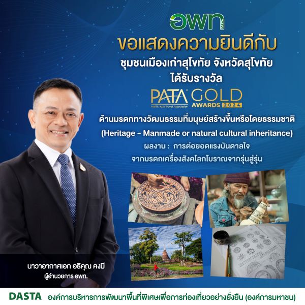 องค์การบริหารการพัฒนาพื้นที่พิเศษเพื่อการท่องเที่ยวอย่างยั่งยืน (องค์การมหาชน) หรือ อพท. ส่งชุมชนท่องเที่ยวจากพื้นที่พิเศษสุโขทัย คว้ารางวัล PATA Gold Awards 2024 สาขารางวัลด้านมรดกทางวัฒนธรรมที่มนุษย์สร้างขึ้นหรือโดยธรรมชาติ และ สาขารางวัลด้านวัฒนธรรมการแสดงท้องถิ่นและทัศนศิลป์ ตอกย้ำความสำเร็จจากความมุ่งมั่นต่อการพัฒนาพื้นที่แหล่งท่องเที่ยว ยกระดับมาตรฐานชุมชนท่องเที่ยว สนับสนุน การเสนอแหล่งท่องเที่ยวไทยประกวดรางวัลระดับนานาชาติ ตอบโจทย์นโยบาย Ignite Tourism Thailand ส่งเสริมเมืองน่าเที่ยวของไทย