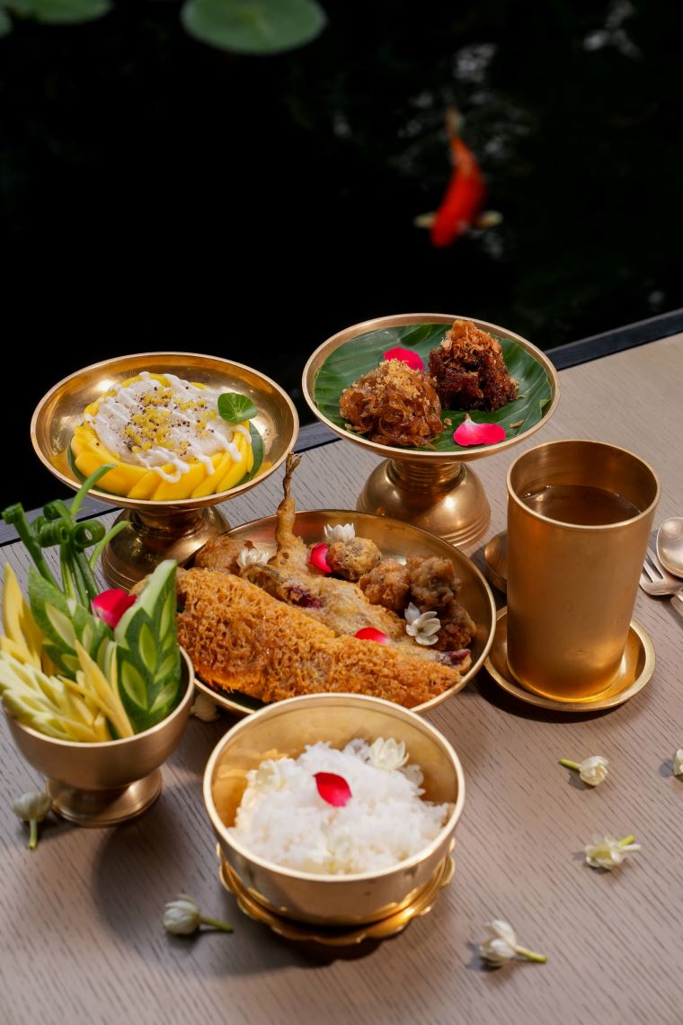 ชุดข้าวแช่ จิม ทอมป์สัน นำเสนอข้าวอบควันเทียนและน้ำลอยดอกมะลิ ใช้ข้าวออร์แกนิกจากฟาร์มไร่ทอง จ. เชียงราย นำไปนึ่งจนสุกพอดี พร้อมอบควันเทียนและดอกมะลิให้หอมฟุ้ง ข้าวแช่เสิร์ฟคู่กับชุดเครื่องเคียง 7 ชนิด ได้แก่ ลูกกะปิชุบไข่ทอด เนื้อปลาดุกย่างหอม ๆ ผัดกับกระชายและเครื่องเทศหลากชนิด คลุกเคล้ากะปิรสเลิศจากคลองโคน จ. สมุทรสงคราม หอมแดงยัดไส้ปลาช่อนผัดหวาน คัดหอมแดงโทนและคว้านเนื้อในออก ยัดไส้ปลาช่อนตากแห้งผัดหัวหอมสุกจนหวานหอม และนำไปชุบแป้งทอดเพื่อสร้างสัมผัสที่กรอบนอกละมุนใน ไชโป๊วผัดหวาน เลือกใช้ไชโป๊วจาก จ. ราชบุรี นำไปผัดกับกระเทียมและน้ำตาลทรายจนขึ้นเงา ปลายี่สนผัดหวาน ใช้ปลายี่สนจาก อ. ปราณบุรี ที่มีรสหวานตัดเค็มลงตัวและหอมกลิ่นหอมเจียว ลูกปลาเค็ม นำไก่ Free Range ผสมปลาอินทรีย์เค็มคลุกเคล้าให้เข้ากันแล้วนำไปชุบไข่ทอด พริกแห้งยัดไส้ปลาช่อน พริกแห้งผ่ายัดไส้เนื้อปลาช่อนผัดให้มีรสหวานแล้วนำไปชุบแป้งทอด พริกหนุ่มเขียวยัดไส้ คัดพริกหนุ่มขนาดพอดี ผ่ากลางและยัดไส้เนื้อกุ้งผสมไก่ ทอดแพไข่อย่างประณีต เพื่อสร้างสัมผัสที่กรอบฟูสวยงามน่ารับประทาน ชุดข้าวแช่ และสำรับเครื่องเคียง 7 ชนิด พร้อมตบท้ายมื้ออร่อยด้วยซิกเนเจอร์เมนูของจิม ทอมป์สันอย่าง ข้าวเหนียวมะม่วง คัดมะม่วงน้ำดอกไม้สุกหอมหวานและข้าวเหนียวมูนสูตรลับเฉพาะของจิม ทอมป์สัน