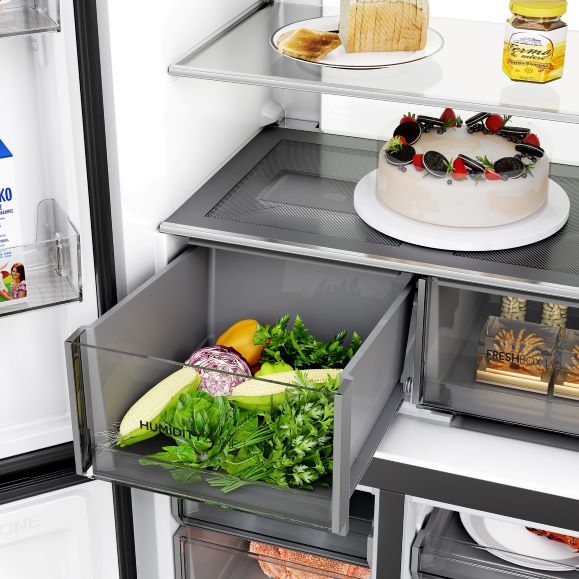 นอกจากนี้ความโดดเด่นและคุณสมบัติด้านการใช้งานของตู้เย็นรุ่น Multi-door HRF-MD679 ประกอบด้วย 4 ไฮไลต์ ได้แก่ 1. Smart Color Screen: รูปลักษณ์มาพร้อมสีสันสดใส สามารถมองเห็นได้อย่างชัดเจนในสภาพแวดล้อมที่มืด หรือในพื้นที่ที่แสงสว่างไม่เพียงพอ 2. Day Light: แสงสว่างที่เปิดกว้างต่อการมองเห็น ผ่านการออกแบบแสงบนพื้นผิวของตู้เย็นที่ให้ความนุ่มนวลช่วยปกป้องสายตา มาพร้อมฟังก์ชันช่วยเพิ่มการมองเห็นทุกครั้งที่เปิดตู้เย็น สามารถหยิบอาหารที่อยู่ด้านในสุดของตู้เย็นได้อย่างสะดวก ทั้งยังเพิ่มแสงสว่างในโซนช่องแช่แข็งทำให้สามารถค้นหาอาหารได้ชัดเจนแม้ในสภาพแวดล้อมที่มืด 3. HCS Plus: ให้อาหารคงความสดยาวนานยิ่งขึ้น 2 เท่า โซนความชื้นถูกออกแบบให้แยกออกจากโซนแห้ง เพื่อกำหนดไว้สำหรับเก็บอาหารประเภทต่าง ๆ โดยโซนความชื้นรักษาระดับความชื้นได้มากถึง 90% และโซนแห้ง 45% ซึ่งช่วยรักษาความสดใหม่ของอาหารได้นานกว่าถึงสองเท่า และ 4. Fresher Shield: ควบคุมอุณหภูมิไร้น้ำแข็งเกาะภายใน โดย Fresher จะช่วยป้องกันความร้อนเข้าสู่โซนช่องแช่แข็งได้อย่างมีประสิทธิภาพโดยไม่มีน้ำแข็งเกาะ ภายในตู้เย็น ทำให้สามารถคงคุณค่าโภชนาการไว้ได้อย่างเหมาะสม