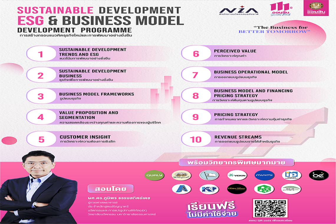 ดร.กริชผกา กล่าวเพิ่มเติมว่า แต่อย่างไรก็ตาม การดำเนินธุรกิจตามแนวคิด ESG ยังคงเป็นคำถามที่ผู้ประกอบการจำนวนมากไม่เข้าใจ ดังนั้น NIA โดยสถาบันวิทยาการนวัตกรรม (NIA Academy) จึงร่วมกับธนาคารออมสินจัดทำและพัฒนา “หลักสูตรการสร้างกรอบแนวคิดธุรกิจใหม่และการพัฒนาอย่างยั่งยืน Sustainable Development, ESG and Business Model Development Programme” เพื่อให้ความรู้และเสริมสร้างทักษะที่จำเป็นเกี่ยวกับ ESG เน้นเรื่องการทำธุรกิจใหม่ตามกระแส “การพัฒนาอย่างยั่งยืน” โดยมีประเด็นหลักคือการทำธุรกิจที่หารายได้แต่ยังให้ความใส่ใจต่อผลกระทบที่จะเกิดขึ้นกับสังคมและสิ่งแวดล้อม ทำยังไงถึงจะได้ไอเดียของธุรกิจที่สนับสนุนสังคมให้ดีขึ้น ไม่ทำลายสิ่งแวดล้อม และก็ยังสร้างรายได้ในตัว