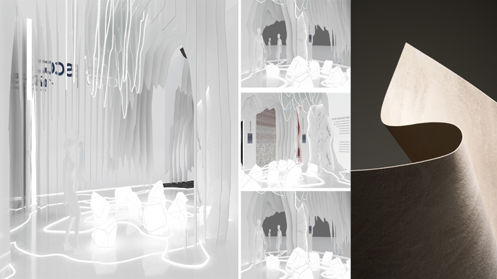 จากระดับน้ำทะเลที่สูงขึ้น ค่าเฉลี่ยปีละ 3-5 มิลลิเมตร ต่อปี ซึ่งไม่มีสัญญานว่าการเพิ่มขึ้นของระดับน้ำทะเลจะชะลอลงเลย หากโลกยังคงเผาไหม้เชื้อเพลิงฟอสซิลต่อ นี่จึงเป็นแนวคิดในการออกแบบพื้นที่นี้ให้เป็นคลื่นน้ำทะเลขนาดใหญ่ นำเสนอผ่านโปรดักส์ STONE DECOR COLLECTION ซึ่งถูกคิดค้นบนความตั้งใจที่จะลดการใช้ทรัพยากร (หิน) เป็นวัสดุตกแต่งผิวจากหินธรรมชาติแท้ ด้วยเทคโนโลยีขั้นสูงในการผลิตความบางเพียง 1.5-2 มม. โดยใช้นวัตกรรมการผลิตที่สกัดหน้าหินจากหินก้อนมหึมา ให้กลายเป็นแผ่นบางๆ ก่อนใช้ไฟเบอร์กลาสลอกออกมาด้วยวิธีพิเศษ จนกลายเป็นหินแผ่นบางที่มีลวดลายและเนื้อสัมผัสเหมือนหินธรรมชาติ เมื่อมีความเบาบางจึงง่ายต่อการติดตั้ง และช่วยลดต้นทุน ทั้งการขนส่ง และการก่อสร้าง