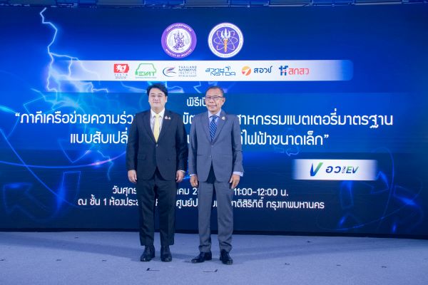 นายศุภชัย ใจสมุทร ที่ปรึกษารองนายกรัฐมนตรี (นายอนุทิน ชาญวีรกูล) เป็นประธานในพิธีเปิดตัว “ภาคีเครือข่ายความร่วมมือการพัฒนาอุตสาหกรรมแบตเตอรี่มาตรฐานแบบสับเปลี่ยนได้ สำหรับยานยนต์ไฟฟ้าขนาดเล็ก” ซึ่งจัดโดย สมาคมเทคโนโลยีระบบกักเก็บพลังงานไทย และเครือข่ายพันธมิตรภาครัฐและเอกชน ภายในงาน International Energy Storage Forum 2024 - TESTA Annual Symposium ครั้งที่ 4 ณ ห้องประชุม MR 111 ศูนย์การประชุมแห่งชาติสิริกิติ์ กรุงเทพฯ โดยมีนายดนัยณัฏฐ์ โชคอำนวย ที่ปรึกษารัฐมนตรีว่าการกระทรวงอุตสาหกรรม ดร.สุมิตรา จรสโรจน์กุล ผู้อำนวยการศูนย์เทคโนโลยีพลังงานแห่งชาติ (เอ็นเทค) สำนักงานพัฒนาวิทยาศาสตร์และเทคโนโลยีแห่งชาติ (สวทช.) ดร.เกรียงศักดิ์ วงศ์พร้อมรัตน์ ผู้อำนวยการสถาบันยานยนต์ นายกฤษฎา อุตตโมทย์ นายกสมาคมยานยนต์ไฟฟ้าไทย และ ดร.พิมพา ลิ้มทองกุล นายกสมาคมเทคโนโลยีกักเก็บพลังงานไทย เข้าร่วมการเปิดตัวครั้งนี้ ภาคีเครือข่ายนี้มีเป้าหมายหลักในการลดข้อจำกัดของการใช้งานแบตเตอรี่ในประเทศไทย ครอบคลุมประเด็นด้านราคา ความปลอดภัย และคุณภาพ โดยจะดำเนินการผ่านการพัฒนามาตรฐานกลางในด้านขนาด ระบบไฟฟ้า การเชื่อมต่อ และการสื่อสาร เพื่อยกระดับอุตสาหกรรมยานยนต์ไฟฟ้าของไทยสู่มาตรฐานสากล