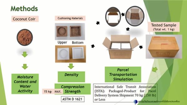 โดยตัวอย่างขวดแก้วบรรจุแยมที่ใช้ในการทดสอบไม่เกิดการเสียหายใดๆ ยังคงมีสภาพสมบูรณ์ดังเดิมหลังผ่านการทดสอบ แสดงให้เห็นว่าวัสดุกันกระแทกจากขุยมะพร้าวสามารถใช้ทดแทนวัสดุกันกระแทกจากโฟมได้ในการขนส่งแบบพัสดุโดยมีข้อดีเพิ่มเติมในประเด็นของการช่วยลดผลกระทบต่อสิ่งแวดล้อมและการใช้ประโยชน์จากวัสดุเหลือทิ้งทางการเกษตร ซึ่งสอดคล้องกับแนวทางของเศรษฐกิจหมุนเวียน (Circular Economy)