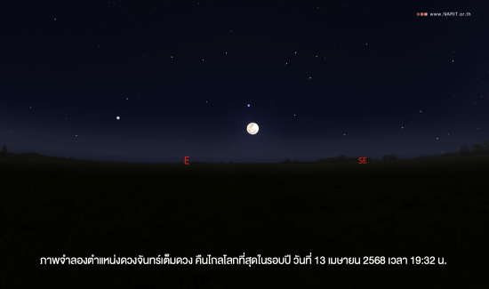 นายศุภฤกษ์ คฤหานนท์ ผู้จัดการศูนย์บริการวิชาการและสื่อสารทางดาราศาสตร์ กล่าวว่า วันที่ 13 เมษายน 2568 จะเกิดปรากฏการณ์ “ดวงจันทร์เต็มดวงไกลโลกที่สุดในรอบปี” หรือ “ไมโครฟูลมูน” (Micro Full Moon) ผู้สนใจสามารถเริ่มสังเกตดวงจันทร์ได้ตั้งแต่เวลาประมาณ 18:48 น. บริเวณขอบฟ้า ทางทิศตะวันออก ช่วงเวลาดังกล่าวดวงจันทร์จะโคจรห่างจากโลกออกไปประมาณ 406,000 กิโลเมตร ส่งผลให้ดวงจันทร์เต็มดวงในคืนนั้นมีขนาดปรากฏเล็กกว่าปกติเล็กน้อย ชมได้จนถึงรุ่งเช้าของวันที่ 14เมษายน 2568